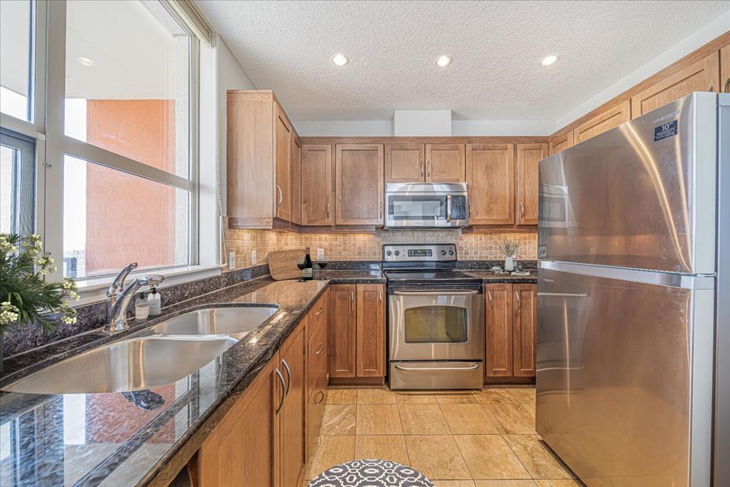 Fall in love with this stunning top-floor corner unit, offering breathtaking city views! This bright, sunny apartment features high ceilings, floor-to-ceiling windows, and a unique design. The open-concept living space is ideal for gatherings with a large kitchen, granite countertops, and a breakfast bar. Enjoy a spacious balcony with a gas outlet for barbecues, and forget gym memberships with a fully equipped on-site gym. All utilities are included with condo fees, plus heated underground parking and 24/7 security. Located in the heart of the Beltline, just steps from 17th Ave shopping, Co-op Grocery Store, Schools, Medical offices, River walk, City parks and the C train !