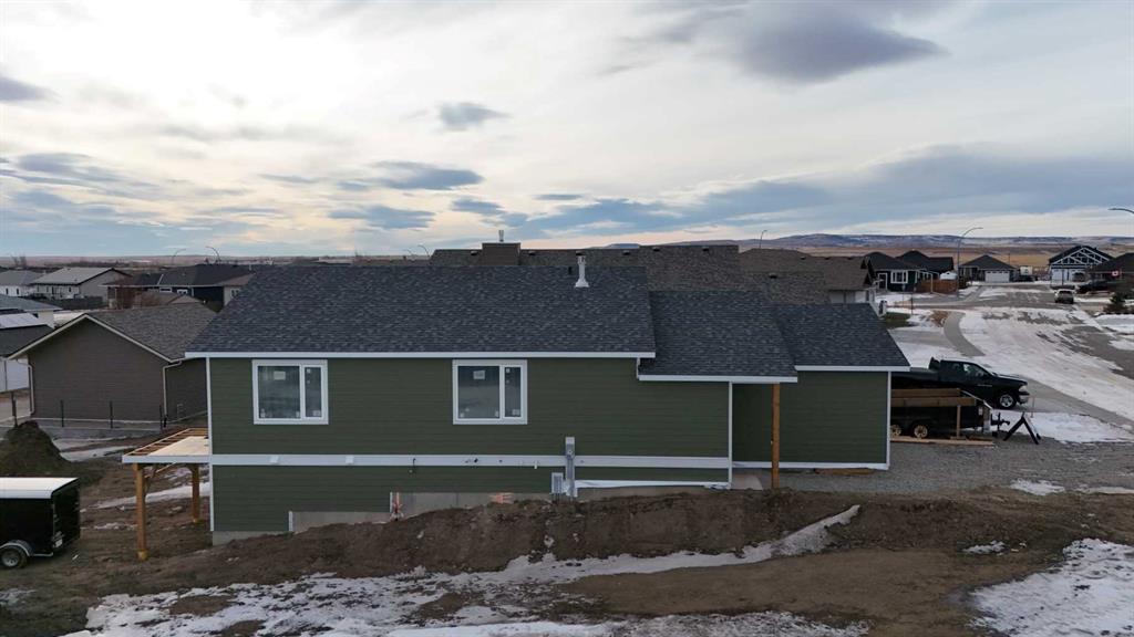 Located in the welcoming town of Nanton, this thoughtfully designed bungalow offers comfort, practicality, and long-term value in a quiet small-town setting. The main floor features a smart, traditional layout with everything you need on one level. A full attached double garage leads into a proper foyer. At the heart of the home is a bright, open-concept living area anchored by a gas fireplace. The living room flows seamlessly into the dining area and kitchen, making it ideal for both everyday living and entertaining. The kitchen offers an island with seating, ample cabinetry, and direct access to the rear deck, extending your living space outdoors.