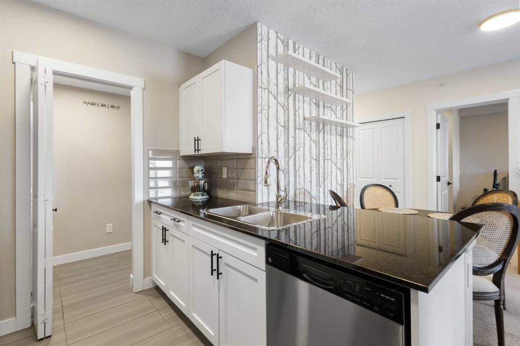 Offering over 750 sq ft (RMS), the layout is efficient, stylish, and highly functional. The contemporary kitchen showcases white cabinetry, stainless steel appliances, tile backsplash, a pantry, and black granite countertops. A peninsula accommodates up to three bar stools, creating an ideal space for casual dining and entertaining. The open living and dining area is filled with natural light from its east exposure, enjoying warm morning sun while remaining comfortable throughout the day. From here, step out to the concrete patio, which provides privacy along with convenient access to walking paths and shared green spaces with picnic tables.
