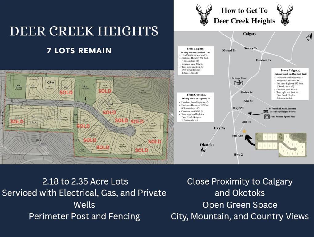This 2.23-acre country residential lot offers the perfect blend of rustic charm and modern convenience. Surrounded by ranch-style fencing, it creates a welcoming, secure atmosphere that beckons you to build your dream home. Perched on this lot, you\'ll be treated to spectacular views of both the Calgary skyline and the majestic Rocky Mountains. Imagine starting your mornings with the sunrise casting a golden hue over the city, and unwinding in the evening as the sun sets behind the towering peaks, painting the sky with vibrant colors. This land provides a serene, private retreat where you can enjoy the tranquility of rural living without sacrificing easy access to urban amenities. It’s a place where natural beauty and contemporary living come together to offer an idyllic setting for a fulfilling lifestyle.