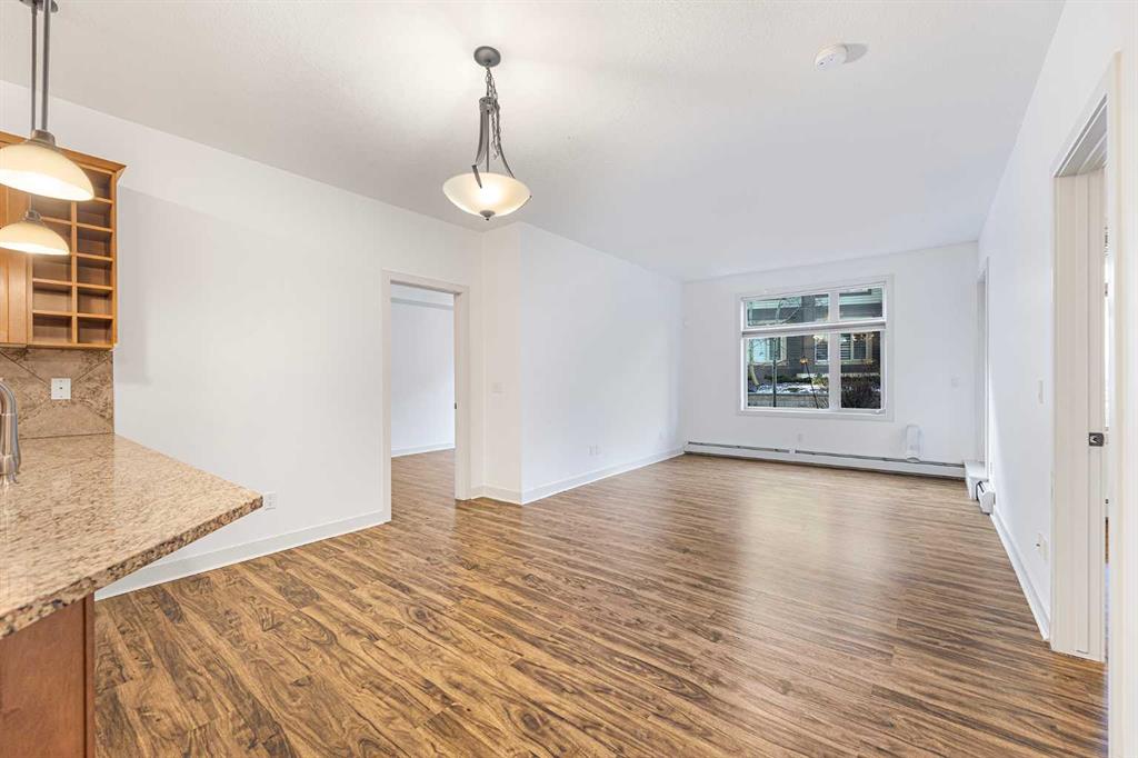 Welcome to a refined main-floor corner unit in the heart of Aspenwoods. This upgraded two-bedroom, two-bathroom condo features an open-concept layout filled with natural light and finished with luxury vinyl plank flooring. The kitchen showcases granite countertops, stainless steel appliances, a built-in wine rack, and a convenient breakfast bar.