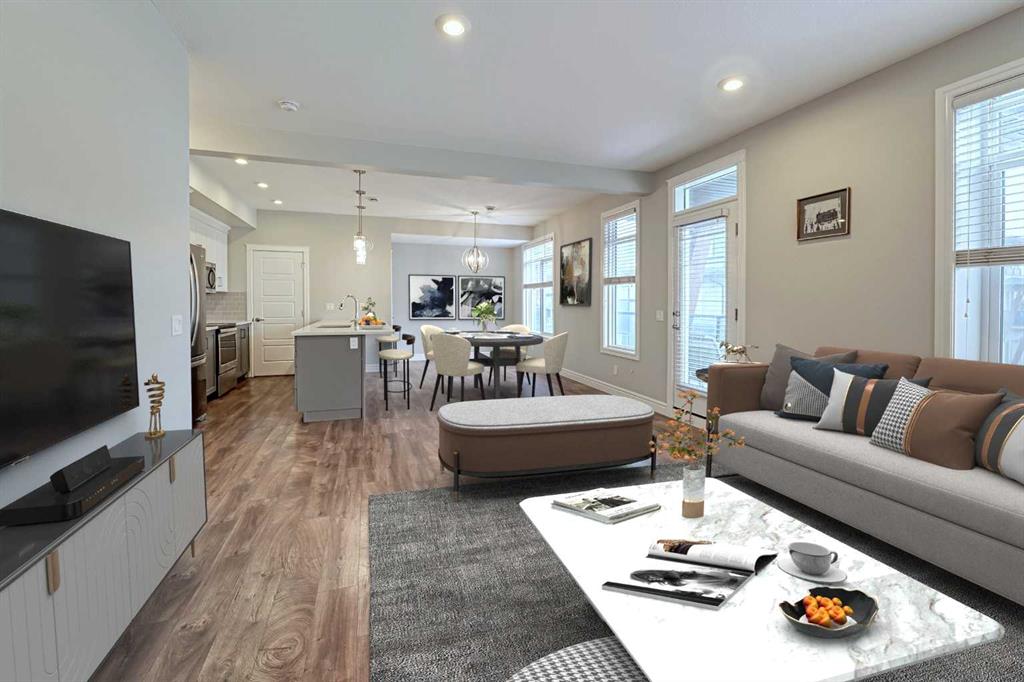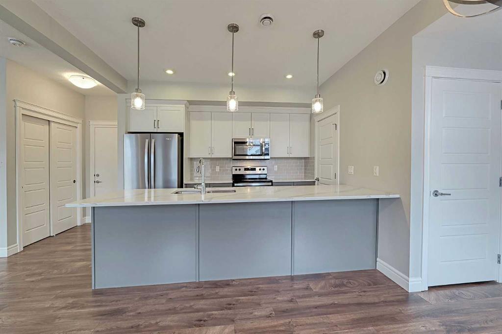 Incredible value in this beautifully appointed townhome within walking distance to an array of amenities (parks, restaurants, shops, YMCA, Joane-Cardinal Schubert high school). Offering 1,552 SF of functional living space with 3 bedrooms, 2.5 bathrooms and an attached double garage, this unit is sure to impress! The bright and open main floor features gorgeous vinyl plank throughout, wall to wall windows, a powder room, living room with access to the balcony and smooth transition to the spacious dining room and chef\'s kitchen complete with stainless steel appliances, over-sized island with eating bar, quartz countertops and a walk-in pantry. Upstairs you will find the Primary bedroom with walk-in closet and 4 piece ensuite, a conveniently located laundry room and 2 additional guest rooms (one with a private balcony) which share a 4 piece bathroom. Enjoy low maintenance living without sacrifices! Book your showing today!