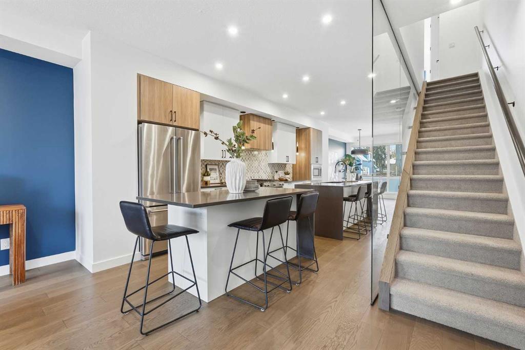 OPEN HOUSE JANUARY 31ST FROM 1:00 - 4:00 PM & FEBRUARY 1ST FROM 12:00 - 3:00 PM!!! Sophisticated and upscale, this 3 bedroom townhome is nestled in the desirable inner city community of Bankview, offering SPECTACULAR CITY AND DOWNTOWN VIEWS along with over 2,600 sq ft of beautifully designed living space. The open main level is ideal for entertaining, featuring hardwood floors, lofty ceilings, and stylish lighting. A spacious dining area flows seamlessly into the well appointed kitchen, complete with quartz countertops, two large islands providing exceptional prep space, abundant storage, and stainless steel appliances including a wine fridge. The inviting living room, anchored by a sleek electric fireplace, offers balcony access for enjoying the views. A 2 piece powder room completes the main level. The second level hosts a quiet office area, two bedrooms—including one with its own private 5 piece ensuite—a 4 piece main bath, and a convenient laundry room. Ascend to the top level to discover a secluded primary retreat featuring a generous walk in closet and a luxurious 5 piece ensuite with dual sinks, a large vanity, freestanding soaker tub, and oversized shower. A versatile flex space on this level is perfect for a home office or fitness area and provides access to a spacious rooftop patio showcasing expansive city and downtown vistas. The entry level includes a recreation/games area and direct access to the heated double attached tandem garage. This prime location offers effortless access to vibrant 17th Avenue, as well as nearby schools, shopping, and public transit.