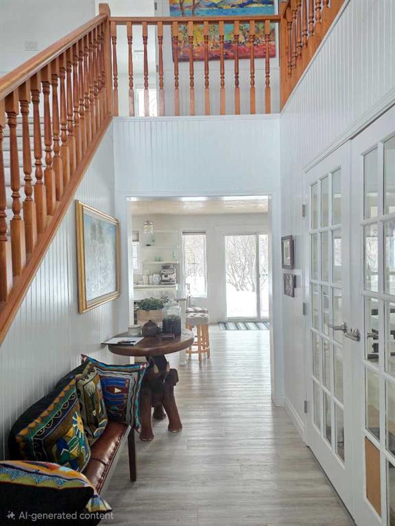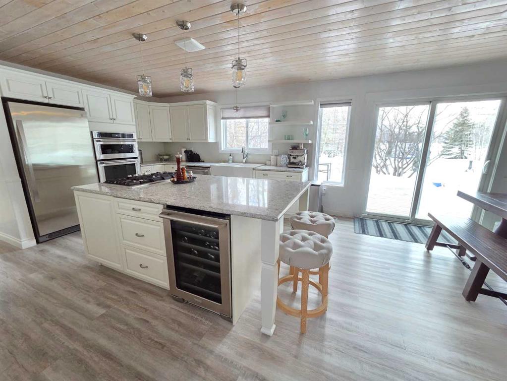 Welcome to the peace and serenity of country living with this charming, renovated home and beautifully treed 5.6 acres of land. Just outside the hamlet of Grovedale and only 15 minutes from Grande Prairie. This spacious home has been completely renovated and boasts a professionally installed kitchen complete with an oversized island with gorgeous granite countertops, gas stove top, wine cooler, lots of beautiful cabinetry. Plus, a wall of pull-out pantry drawers, high-end stainless-steel appliances, and a lovely large farmhouse sink. Patio doors lead from the dining area out to the expansive maintenance free deck. The family room area is separated by glass French doors and boasts a very stylish gas fireplace, with large windows for great views and natural light. There is a large bedroom with a walk-in closet and a wall of wardrobe cabinets, and ensuite with a large soaker tub. The other spacious bedroom on the main level has been made into an office/study room with a nice large window seat, and lots of great storage. There is main floor laundry as well as a 2-piece bathroom. Upstairs you will find another cozy sitting room and study area, as well as the very large master bedroom with a charming gas stove fireplace. A spacious full bathroom that features double sinks, with separate tiled shower and soaker tub. An additional very large bedroom can fit two beds, with lovely window seats and fantastic views out the windows. The double garage has extension to make it larger, is heated and finished with fantastic wood panel walls, plus has an EV charger that can be also used for your RV. Most all the windows and blinds are brand new, and patio doors as well. There is a water softener and RO water system. The well was serviced in 2024, and there is an option to hook up to municipal water if you decide. Shingles were replaced in 2018, and the 2-stage septic system was replaced in 2020. The overhead garage doors are new in the last 5 years, as well as the deck upgraded to composite maintenance free boards. The yard is landscaped with lots of weeping tile for great drainage, and features a lovely fire pit area, and children’s play fort area. The property is fully fenced and boasts lots of trees. The Driveway that leads to the home has a circle drive around and plenty of parking space. This is a wonderful place to enjoy and call home! Plus its only minutes away from the Nitehawk ski and recreation park.