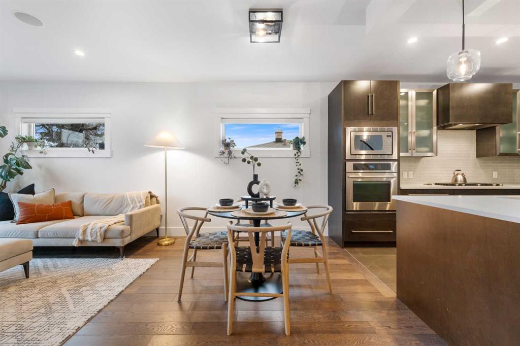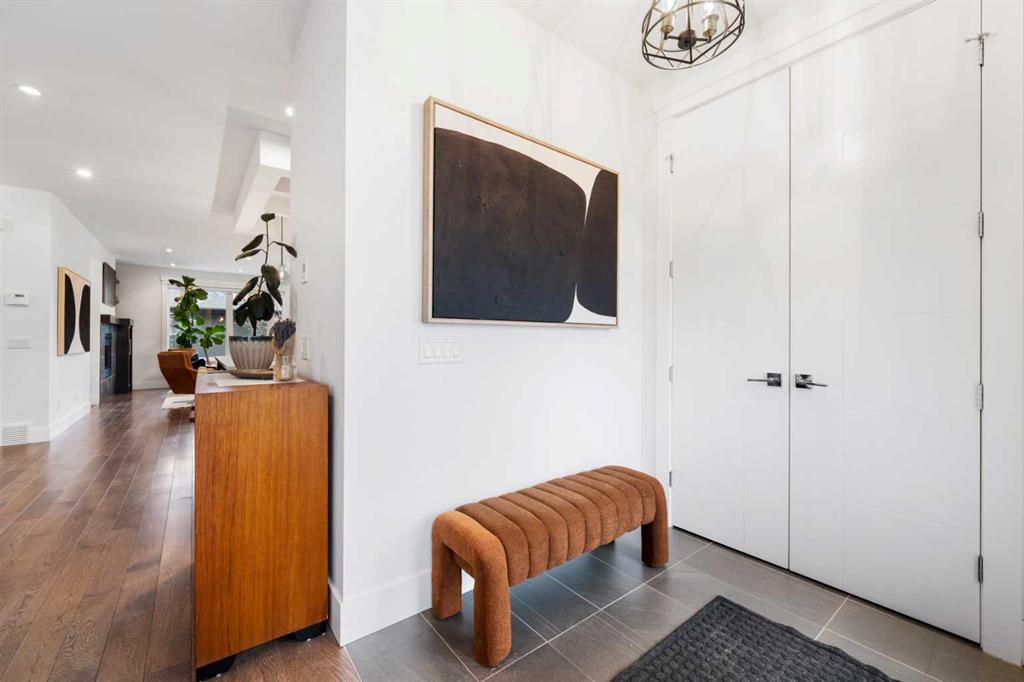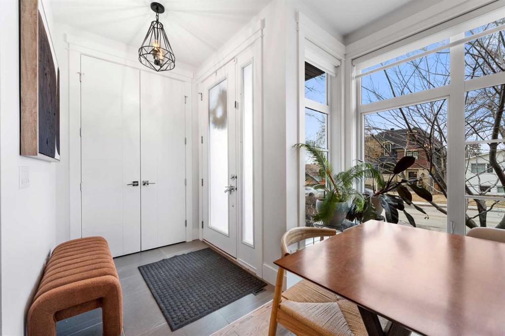 Urban living at its finest. This custom-built contemporary home in the heart of Killarney offers over 2600 sq ft of impeccably designed, fully developed living space, thoughtfully upgraded from top to bottom. Featuring a sunny west-facing backyard, in-floor heating, and central air conditioning, this home blends luxury with everyday comfort. The open-concept main level is flooded with natural light, highlighted by expansive windows, soaring 9’ flat painted ceilings on every floor, and an abundance of pot lights. The gourmet kitchen is a chef’s dream, showcasing quartz countertops throughout, a massive island, loads of drawer storage, sleek custom cabinetry, stainless steel appliances, and a gas range—perfect for both entertaining and daily living. On one side the spacious dining area and the other a cozy yet sophisticated living room, anchored by a striking gas fireplace with custom built-ins. A separate mudroom and stylish powder room complete the main floor. Upstairs, the primary retreat is a true sanctuary, spacious enough for a king-sized bed and featuring a boutique-hotel-inspired ensuite with double vanities, a soaker tub, an oversized glass steam shower, in-floor heating and a custom walk-in closet with built-in organizers. Two additional generously sized bedrooms—one with a custom built-in desk—are complemented by a beautifully appointed full bathroom and convenient upper-floor laundry. The fully finished lower level expands your living space with an additional bedroom and full bathroom, plus a large family room complete with a wet bar, beverage fridge, custom entertainment unit, and room for a home gym, movie nights, or hosting guests. In-floor heating ensures year-round comfort. Superior finishes throughout include stunning wide-plank hardwood flooring, while thoughtful upgrades such as a home audio system with built-in speakers and irrigation add everyday ease. The double detached garage features 10’ ceilings for extra storage potential and an 8’ high door for easy access. Designed for effortless indoor-outdoor living, the home opens to a private, low-maintenance fenced backyard—ideal for BBQs, lounging, or dining al fresco on the concrete patio through expansive glass patio doors. Perfectly situated in desirable Killarney, just steps from Holy Name School, one block from a green space and park, and minutes to trendy cafés, boutique shopping, downtown, and the C-Train. This is the ultimate executive home for those seeking luxury, style, and a truly effortless urban lifestyle.