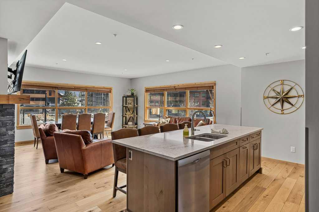 this property is a rare Tourist Home designated 2-bedroom + den (3rd bedroom) investment opportunity in White Spruce Lodge located in Spring Creek in downtown Canmore. This property is turn-key and sold fully furnished, with rentals on the books for 2026. This lovely corner unit has windows on all sides bringing in abundant natural light, great views, and is located on the highly sought after Spring Creek Plaza overlooking the pond and steps from the Bridgette Bar restaurant, other great retail amenities, parks, paths and walking distance to Main Street Canmore. The large gourmet kitchen and living area are ideal for family gatherings complete with stainless appliances, large quartz counters, hardwood floors, and a stone gas fireplace. The primary bedroom features a king bed, walk in closet and a 5-piece spa inspired ensuite bathroom. White Spruce Lodge has an inviting courtyard hot tub, an exercise room on the main level, with an underground titled parking stall and assigned storage cage for the condo.