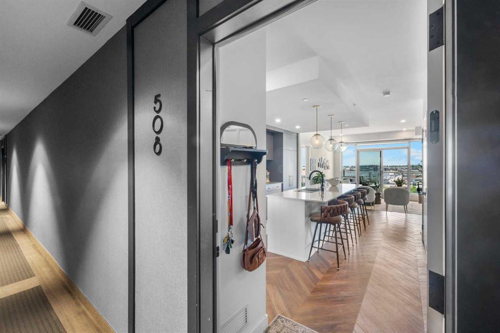 Discover sophisticated living in this upscale 2-bedroom, 2 bathroom condo nestled in the heart of West Springs. Perfect for professionals or downsizers, this concrete-built, low-maintenance residence offers quiet comfort, durability, and a prime location in a vibrant, walkable community. Step through the generous foyer into a sun-drenched open-concept layout featuring expansive windows and sliding glass doors that flood the space with natural light and showcase breathtaking views, including the mountains. The spacious living area opens seamlessly to a large balcony (one of the few private ones in the building), ideal for morning coffee or evening relaxation. The chef-inspired kitchen impresses with integrated stainless steel appliances, a gas range, and a large eat-up island—perfect for entertaining. The adjacent dining room is both generous in size and versatile enough to serve as a home office or library. Retreat to the primary suite offering a large walk-in closet and a spa-like 4-piece ensuite with dual vanities and a walk-in shower. A second bedroom and a stylish 4-piece bath with deep soaker tub provide flexibility for guests or family. The flexibility of the bedrooms and bathrooms in this unit would also lend itself to two adults easily sharing the space. You’ll also appreciate the in-suite laundry and flooring with acoustic underlay throughout. Additional features include: air conditioning, 1 titled underground parking stall, EV charging stations & bike storage, owner’s lounge on same level, lobby concierge, ground-level restaurants, shops, wellness studios, community gardens. Just minutes from Calgary French & International School, Webber Academy, Rundle College, and Ernest Manning High School, and quick access to Stoney Trail for weekend getaways. This quiet unit is extremely well-maintained and move-in ready, and combines luxury, lifestyle, and location into one exceptional offering.