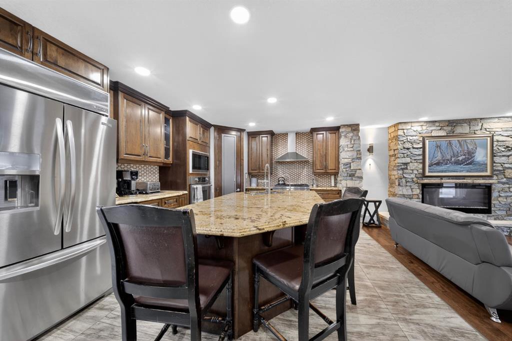 The impressive chef’s kitchen is the centerpiece, featuring a massive granite island, abundant cabinetry and counter space, extensive stonework, and steel appliances. Main-floor laundry, with an additional washer/dryer rough-in, adds convenience and flexibility. A warm and inviting family room with electric fireplace at the front of the home. Additionally, a second living space with another fireplace that opens out the sliding doors to the backyard.