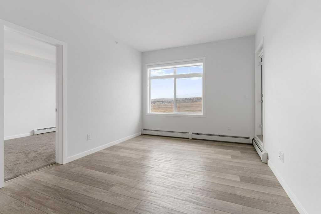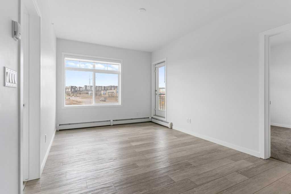 Stylish, well laid out TOP FLOOR 2 bedroom, 2 bathroom condo. Located in popular Sage Hill in the well maintained \"Mark 101\" by Shane Home, walking distance to shopping and amenities! Features include 9 foot ceilings, Luxury Vinyl Plank flooring and quartz counter tops throughout , vinyl windows with sleek blinds, and in-suite laundry. As you enter the unit, you will find a 4 piece bathroom, and the laundry closet. The modern Kitchen has a functional and warm feel, with dark brown laminate finished cabinets, quartz countertops, modern white subway tile backsplash and stainless steel appliances. Opening on to the kitchen is the family room with a large, bright, sunny window and a patio door leading to your private covered balcony, with gas line roughed in. The primary bedroom has an en-suite bathroom and double closets. The second bedroom is across the family room from the primary allowing for maximum privacy. This unit also includes 1 titled underground parking stall, a storage locker, and there is secure bike storage available in the parkade. Condo fees are affordable and include heat/water/sewer. Located just steps away from public transit, shopping, restaurants, and many other amenities, this is a GREAT place to live OR a wonderful investment property.