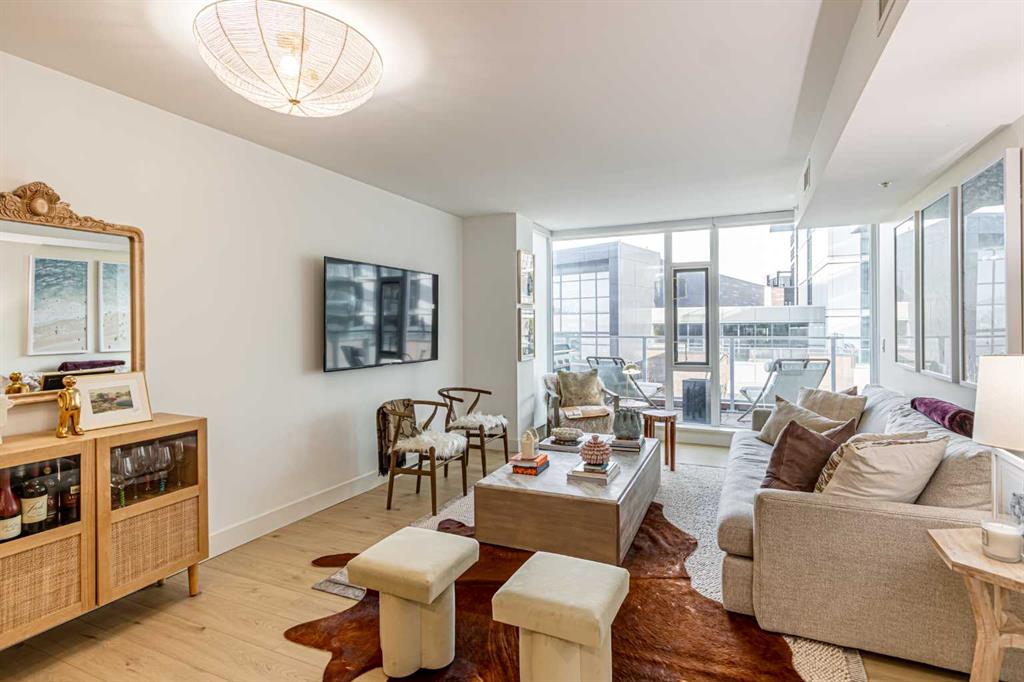 Discover the ultimate condo living experience in this stunning 2 bed + den unit at Evolution by Bosa Developments, nestled in the vibrant East Village of Downtown Calgary. This immaculate residence boasts an impressive and rare **500+ sq ft private patio** with sunny south exposure, a rare find in condo living—perfect for entertaining or enjoying a quiet evening outdoors. The thoughtful floor plan includes two spacious bedrooms, with the primary suite featuring an ensuite bathroom and a walk-in closet. The stylish kitchen is equipped with upgraded stainless steel appliances, including a gas range, elegant granite countertops, and a convenient breakfast bar, seamlessly flowing into the adjoining dining room and spacious living room, which provides direct access to the coveted outdoor space.