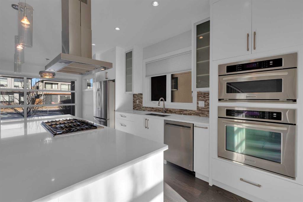 Welcome to Richmond/Knob Hill! This beautifully finished home offers 4 bedrooms, 3.5 bathrooms, a thoughtful layout, and a fully developed basement—truly a standout property. The bright, open-concept main floor features 9-foot ceilings, hardwood floors, and oversized windows that fill the space with natural light. The tiled front entry includes a spacious closet with French doors and custom organizers (no wire shelving in this house!), leading into a generous living room perfect for entertaining or settling in for a movie night. The chef-inspired kitchen boasts quartz countertops, a large island, ceiling-height cabinetry, a gas cooktop, built-in wall oven and microwave, and a pantry with custom shelving. It flows seamlessly into the dining area, which comfortably seats eight and is anchored by a gas fireplace with built-ins and a south-facing window. A discreetly positioned 2-piece powder room and a mud room with French door closet and additional built-ins complete the main level. Upstairs, an extra-wide staircase and skylight create an inviting transition to the second floor, where you’ll find 9-foot ceilings and an ideal layout. The private primary suite overlooks the backyard and includes a spacious 5-piece ensuite with dual vanities, a deep soaker tub, an oversized shower, and a dreamy walk-in closet with extensive built-ins. Two additional large bedrooms sit at the opposite end of the home, each with built-in closets, large windows, and a shared balcony complete with soffit lighting. A 4-piece bathroom with quartz countertop and a dedicated laundry room with soft-close cabinetry complete this level. The basement feels anything but below-grade, thanks to large windows and cozy in-floor heat. The rec room offers a great space for family time and includes a well-appointed wet bar. A fourth bedroom with two windows and a huge walk-in closet sits next to a full 4-piece bathroom. Additional highlights include a linen closet, ample storage, and an exceptionally tidy utility room. Outside, the sunny south facing backyard features a lovely deck and leads to a detached double garage (insulated and drywalled). *LOCATION - 5 minute walk to Richmond Elementary, 3 kms to Mount Royal University, 10 blocks to Marda Loop, easy access to all major commuter routes and only a 10 minute drive into downtown. *BONUS - central vac rough-in, sump pump, freshly painted, professionally cleaned and move-in ready!
