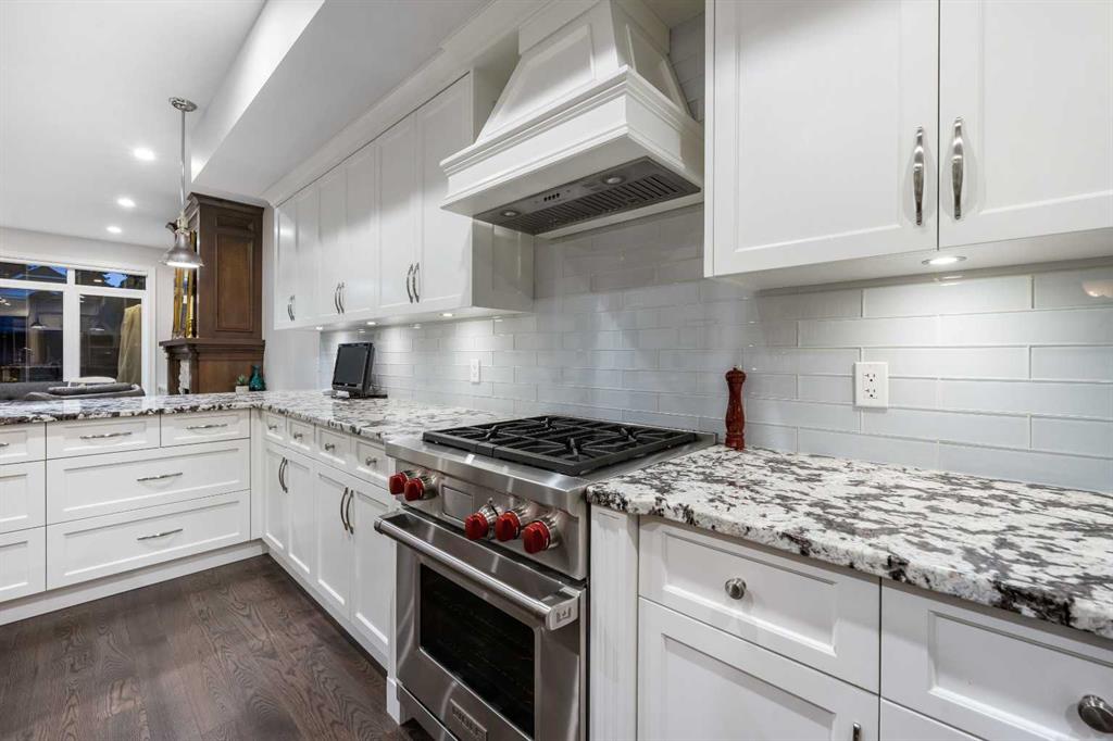 The layout is remarkably flexible to suit your lifestyle. Off the front entry, a spacious flex room works beautifully as a formal dining room, but is equally ideal as a second home office or study. At the rear, the open-concept living room is anchored by a custom fireplace with built-ins and flows to the chef’s kitchen with Wolf gas range, Miele dishwasher, granite counters, walk-in pantry, and large island. A statement powder room featuring a gold-leaf backsplash with hidden lighting adds luxury.