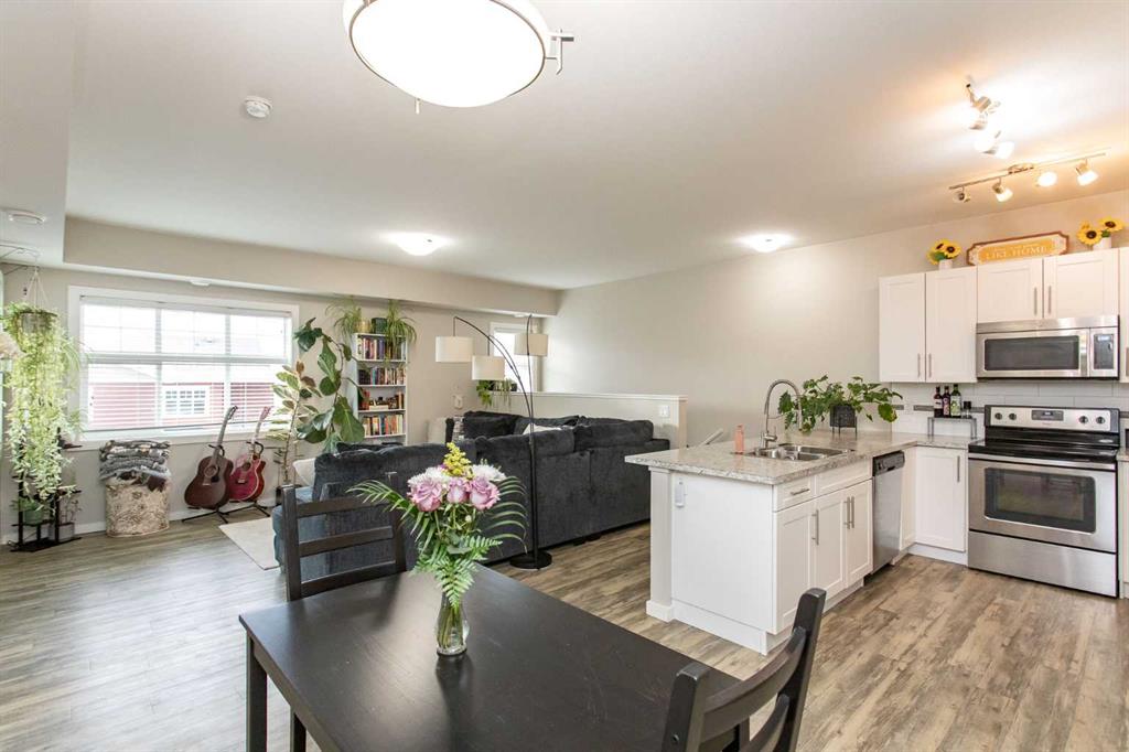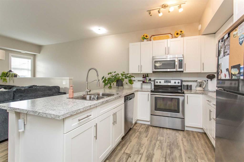 Find the perfect combination of comfort and convenience in this two bedroom two bath condo in Valley Crossing. This development is highly desirable for its quick and easy access to QEII for commuters and it\'s close proximity to great recreation options close to home - with the Abbey Centre and some beautiful walking trails just steps from your door. Ideally situated on the outside corner of the complex, where it enjoys a quiet privacy and a sunny south facing balcony overlooking the trees - this beautiful upper level unit provides a perfect tranquil escape after a long day. Warm and inviting and in excellent condition, this home has been obviously well maintained and gently lived in. An open floor plan with high ceilings and neutral plank flooring flows smoothly from a clean white kitchen with eating bar to a separate dining area and through a spacious bright living room out to that covered balcony. The primary bedroom is a private sanctuary and features both a walk-in closet and a full four piece ensuite. The second bedroom currently serves as a perfect home office, and there is a second full bath and a separate laundry/utility room with storage. Included are two powered parking stalls within easy view, and visitor parking close to the door. This building is pet friendly, professionally managed, and the condo fees are comparatively low.