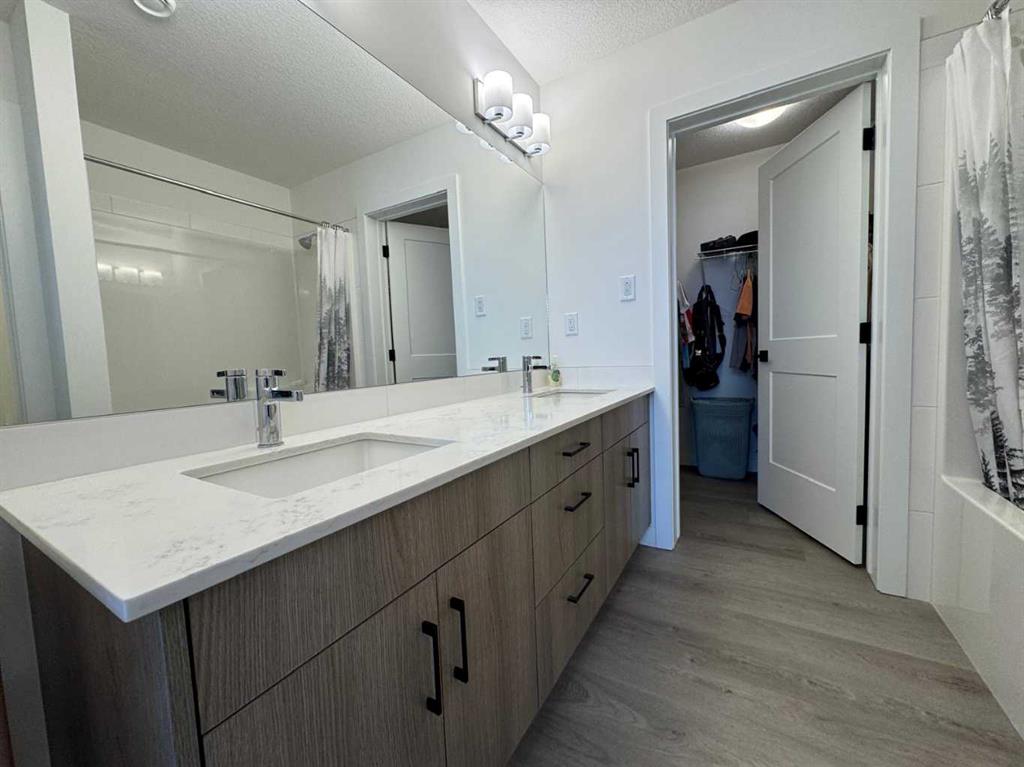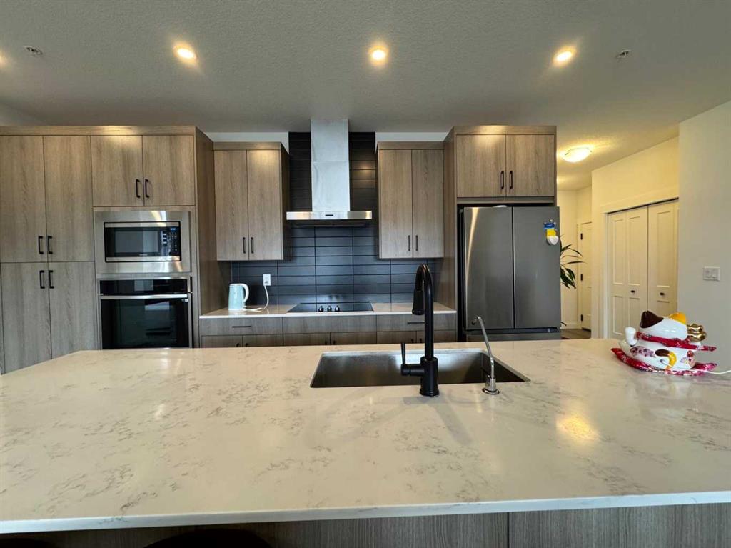 Bright and Spacious with Functional layout! Experience the comforts of modern living with this stunning 2-bedroom, 2-bathroom corner unit, loaded with upgrades, well located in Logel Homes\' Livingston Views – Livingston\'s vibrant, growing community. This home offers easy access to airport, downtown, shopping, dining, and major highways including Stoney Trail & Deerfoot Trail. Enjoy the upgraded Executive kitchen with open design and upgraded with a premium stainless-steel appliance package; built-in wall oven and microwave cabinet tower, quartz counters, oversize center island with large undermount sink, overlooking the huge living room and dining room with patio doors to oversize balcony (20’5” x 6’2”) where you can enjoy your BBQ and decorate with your favorite patio furniture. The Spacious Master bedroom includes a large ensuite bath: with double sinks with large quartz counter, toilet with separate door and a walk in closet with door. Spacious 2nd bedroom: - with windows on both sides which is an added feature of this corner unit. 2nd bathroom upgrade includes a walk in shower with glass doors, quartz counters. Other features of this beautiful unit: - 9-Ft. Ceilings, a breathe easy with Logel Homes\' exclusive fresh air intake system, in unit Air Conditioning unit, spacious entry and a large laundry room with ample storage space. This unit also comes with a titled heated underground parking and an assigned storage unit.