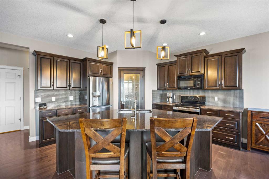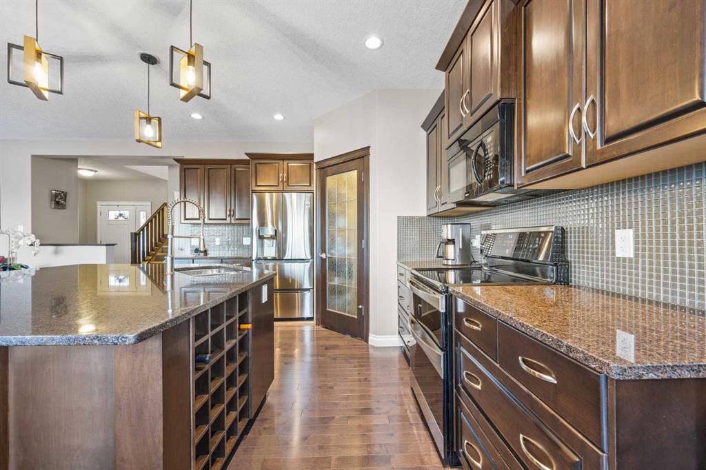 The main floor is bright, open, and perfectly oriented to take in the scenery. At the heart of the home, the kitchen blends style and function with rich cabinetry, granite countertops, and a large central island with seating—ideal for casual meals or gathering with guests. A walk-through butler pantry provides excellent storage and prep space, while the kitchen flows seamlessly into the dining and living areas, creating a warm, connected space where the views truly shine. A convenient powder room and main-floor laundry complete this level.