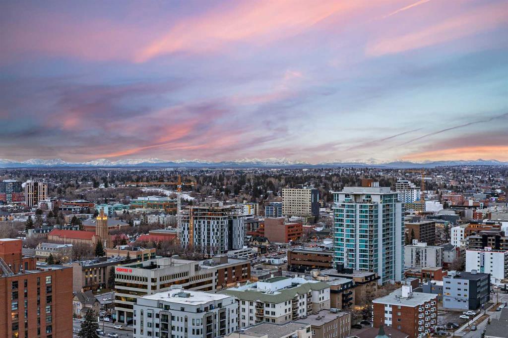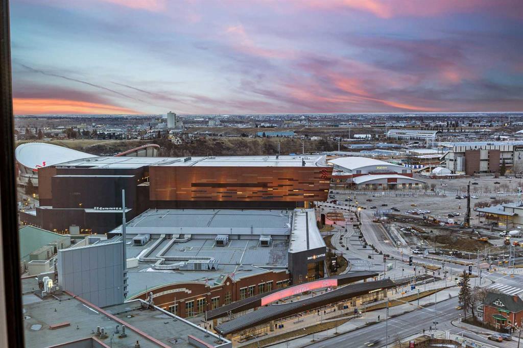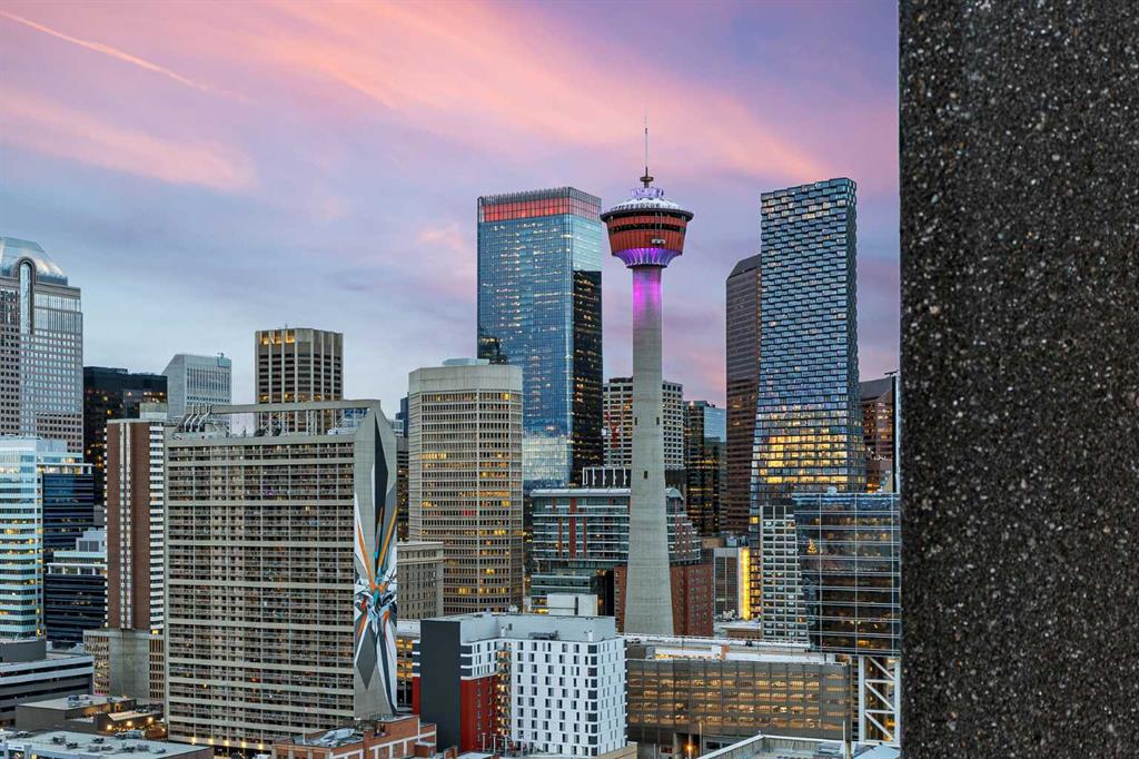 RISING above the city in the striking NuEra building, this exceptional 22nd-floor CORNER residence offers truly BREATHTAKING, UNOBSTRUCTED VIEWS of DOWNTOWN Calgary, the distant ROCKY MOUNTAINS, and Stampede Park. Framed by floor-to-ceiling windows and enhanced by 9-foot ceilings, the condo is flooded with natural light and delivers a SPECTACULAR SKYLINE backdrop—stunning by day and absolutely MAGICAL at night. Enjoy a front-row seat to the Stampede FIREWORKS, visible right from your bed, along with unforgettable SUNSETS and panoramic cityscapes. The thoughtfully designed OPEN CONCEPT layout is ideal for both everyday living and entertaining. The modern kitchen features custom cabinetry, GRANITE COUNTERTOPS, STAINLESS STEEL APPLIANCES and a LARGE ISLAND that flows seamlessly into the living and dining areas. The primary bedroom showcases expansive windows, a walk-through closet and a private ensuite. The second bedroom is positioned on the opposite side of the unit for added privacy. It offers SPECTACULAR DOWNTOWN VIEWS and convenient access to a sleek 3-piece bathroom—perfect for guests, a home office, or a roommate setup. Just PROFESSIONALLY PAINTED. Additional highlights include in-suite laundry, secure UNDERGROUND parking, a storage locker, bike storage, and visitor parking. Residents enjoy premium amenities such as a fully equipped FITNESS CENTRE, residents’ lounge, OUTDOOR TERRACE and professional CONCEIRGE service. Ideally located in the heart of Victoria Park, just steps from Stampede Park, the new ENTERTAINMENT district, 17th Avenue, the C-Train, Sunterra Market and some of Calgary’s best DINNG, shopping, and NIGHTLIFE. This is downtown living at its finest. Embrace this opportunity to own a high-rise condo with UNMATCHED VIEWS, lifestyle and convenience. An opportunity not to be missed — ideal for those right-sizing, purchasing their first home, or seeking an investment.