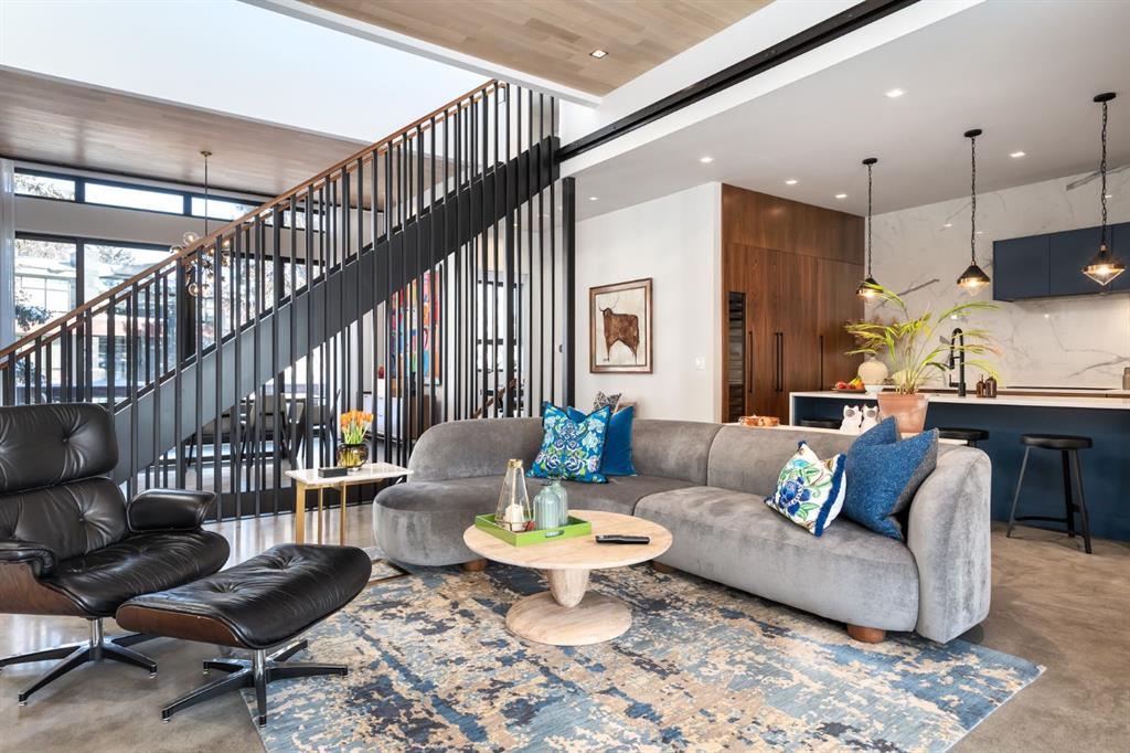 Set within one of Calgary’s most sought after inner city pockets, this architecturally driven residence blends scale, design & everyday livability. Situated on a south facing lot just over ¼ acre, a rare inner city offering, this custom Homes by Avi build with interiors by Connie Young Design balances striking architecture with functional living & exceptional craftsmanship. Featured in a design magazine & recognized with multiple awards, the home reflects a level of design rarely seen within inner city living. The 1.5 storey layout offers the primary suite, two bedrooms & a den on the main level, plus two upper bedrooms each with ensuite & a bonus room, creating flexibility for families, right sizers, or executive living. Architectural features include polished concrete floors with in floor radiant heat, brushed oak engineered hardwood ceilings, recessed LED lighting, triple pane windows, & an open riser staircase beneath soaring 20 foot ceilings enhancing light & volume. The main living area features 12 foot ceilings, a suspended Scandinavian inspired gas fireplace, & two steel barn doors that open for flow or close for privacy from the bedroom wing. Oversized sliding glass doors connect the dining area to the front patio, while the mudroom offers built in storage & organization. Designed for everyday living & entertaining, the kitchen features book matched walnut inspired cabinetry, floating cabinets, porcelain tile backsplash, & a premium appliance package with Wolf built in wall oven, steam convection oven, Sub Zero integrated refrigeration, vertical freezer, & oversized wine fridge. The primary retreat offers patio access, a walk in closet, & a spa inspired ensuite with 14 foot ceilings, oversized steam shower & soaker tub, bidet toilet, & custom wood feature wallpaper for a five star hotel feel. Mechanical highlights include a high efficiency boiler, two furnaces, two central A/C units, HRV, water softener, sump pump, main floor mechanical room, & heated attached garage with epoxy floors & integrated wall storage. Oversized sliding glass doors open to a pergola covered patio with hot tub & gas fire table for effortless indoor outdoor living. The south facing backyard overlooks the outdoor skating rink, playgrounds, baseball diamond, & green space with direct access to the Elbow River, pathways, Stanley Park Outdoor Pool, Lawn Bowling Club, tennis courts, plus nearby amenities including the Saddledome & MNP Community & Sport Centre. Minutes to downtown, top rated schools, the Glencoe Club, & Calgary Golf & Country Club. The unfinished basement offers a blank canvas with nearly 10 foot ceilings, ready to customize. With protected sight lines, no direct rear neighbours, & seamless access to green space, this home offers privacy & architectural elegance. Architecturally stunning & designed for everyday living, a rare inner city opportunity.