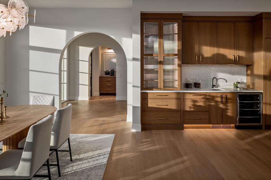 OPEN HOUSES Sat Feb 14th 12-3PM & 4-6PM, Sun Feb 15th 1-4PM! Homes on this exclusive ridge rarely come to market, and this breathtaking two-storey estate is a shining example of elevated inner-city living. With 5,545.89 sq.ft. of exquisitely developed space, this 6 bedroom, 5.5 bath residence blends refined craftsmanship with functional luxury; set against a backdrop of sweeping valley and park views. Step inside to soaring ceilings, pristine engineered hardwood floors, and custom archway details that frame each thoughtfully designed space. The heart of the home begins in the sunlit dining area, perfect for hosting epic dinner parties, and highlighted by west-facing triple-glazed LUX windows. The adjacent chef’s kitchen impresses with stainless steel integrated appliances, including a Wolf gas cooktop, double wall ovens, classic white shaker cabinetry, and a hidden butler’s pantry for discreet prep and storage. The expansive great room invites relaxation with vaulted ceilings and a cozy microcement faced gas fireplace, opening directly to a sunny south-facing deck overlooking endless green space. A main floor guest suite (or executive office) with a private ensuite, a designer powder room, and a spacious mudroom with built-ins complete this level. The fully insulated triple car garage is EV-ready and lift-kit friendly, marrying form and function. Upstairs, a serene primary retreat features elegant vaulted ceilings, a custom walk-in closet, and a spa-inspired 5-piece ensuite with a soaker tub, dual vanities, and a glass shower with bench and niche. Three additional bedrooms (one with an ensuite), an upper laundry room with sink and storage, and a charming library nook provide comfort and convenience for the entire family. The fully developed basement is an entertainer’s dream: featuring a large media lounge, games area, wet bar with brick backsplash and undermount lighting, and a high calibre wine room that secretly accesses the highly systemized maintenance room. A versatile home gym, sixth bedroom with walk-in closet, and additional full bathroom on this level ensure guests feel at home. Noteworthy highlights include: Hydronic in-floor heat in the basement; 2 High-Efficiency furnaces & A/C units; built-in speakers throughout; and quartz countertops in all bathrooms. Located minutes from the University of Calgary, Foothills Hospital, and local shops and restaurants, this timeless home sits in a top-tier school catchment and offers quick access to major routes while maintaining a tranquil, park-like setting. A truly unique opportunity to own a well-appointed, move-in ready home in one of the city’s most prestigious enclaves.