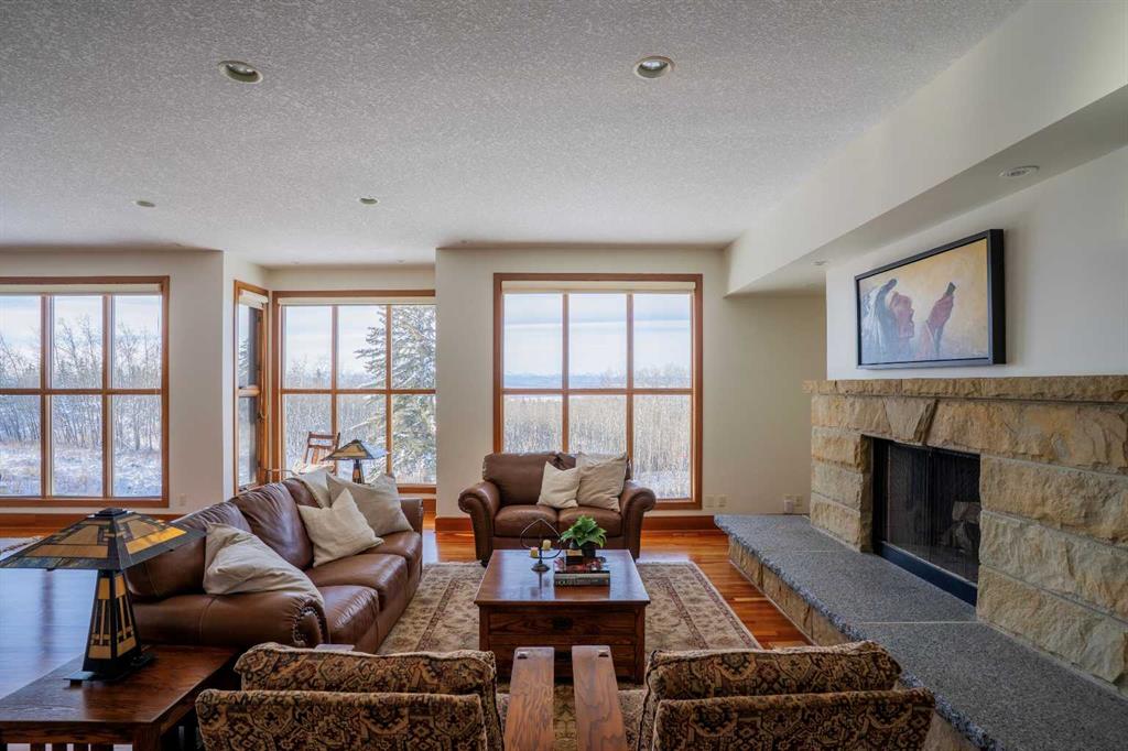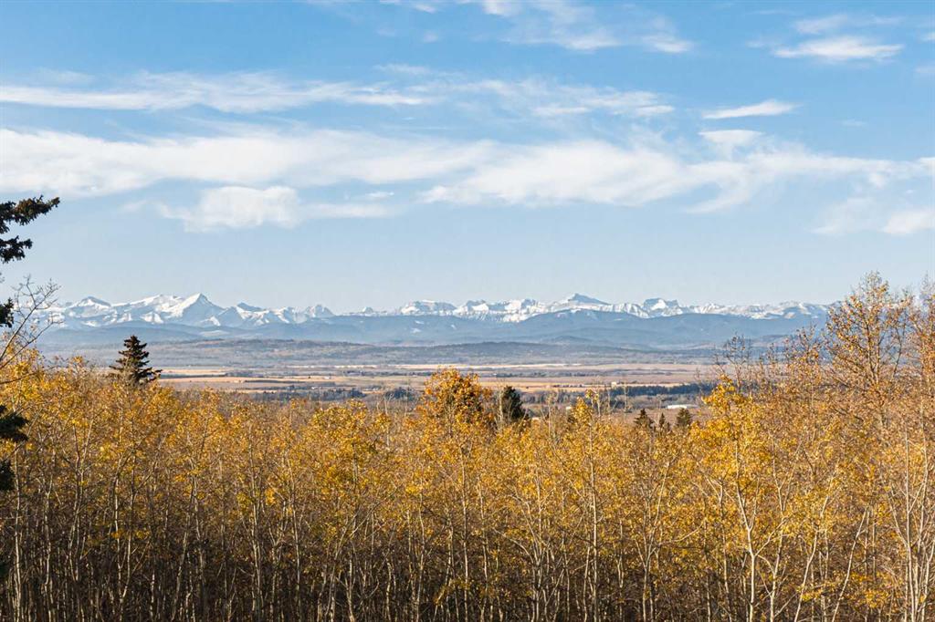 This exceptional, one-of-a-kind property offers the best of Springbank living — privacy, tranquillity, and breathtaking Rocky Mountain views. Set on a picturesque 2.17-acre lot in the heart of Pinnacle Ridge, this walkout bungalow sits high on the ridge, surrounded by beautifully landscaped grounds that provide seclusion from the street and neighbours. Tucked away from main roads, the property features its own private ravine, approximately one acre of mature trees and natural landscape, offering beauty and privacy while minimizing yard maintenance. A circular driveway flanked by mature trees sets the tone from the moment you arrive — this is truly something special. Inside, you’re greeted by stunning mountain vistas and an open layout. The beautifully renovated kitchen features a large island, granite countertops, and high-end appliances, including a Sub-Zero refrigerator, wine fridge, microwave, and 48” Wolf gas range. It opens to a bright dining space and sitting area with access to the large main deck (23\' x 22\'). The spacious living room, complete with a fireplace, perfectly frames the magnificent mountain backdrop. The main-floor primary suite offers a luxurious six-piece ensuite and a generous walk-in closet. The main level also includes a home office, two powder rooms, a walk-in pantry, and a mudroom that connects to an oversized four-car garage. The 54\' x 26\' garage (1,279 sq. ft.) is insulated, drywalled, painted, and finished with epoxy flooring, with half the space offering a 12’3” ceiling that is ideal for large trucks or lifts. The walkout lower level features a large recreation room, a wet bar that seats up to ten, a dedicated theatre room, three additional bedrooms, and two full baths. Cherry hardwood and tile flooring flow throughout the home, with wool carpet in the lower-level bedrooms for added comfort. The exterior showcases stucco and stone, complemented by a newer asphalt shingle roof (2020, 50-year warranty). An enclosed under-deck storage room is ideal for garden tools or a ride-on mower. This immaculate property has been meticulously maintained by its current owners, with recent mechanical upgrades including two new furnaces with humidifiers (2019) and two new air-conditioning units (2024). A truly remarkable estate combining privacy, panoramic views, and refined living in one of Springbank’s most sought-after locations.
