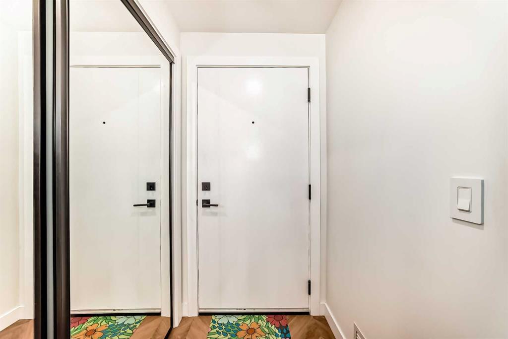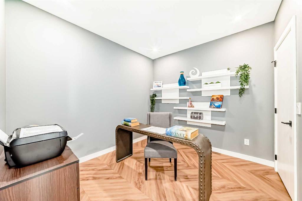 With FULL TIME concierge service, TWO titled underground parking stalls, and lock-and-go convenience, this home is designed for easy, worry-free living. This stunning two-level apartment offers over 1,800 ft² of upgraded living space with 3 bedrooms, 3 full bathrooms, a main floor office, and an upper bonus room. Step inside to experience the quality of a former show suite, with exceptional craftsmanship and thoughtful design throughout. Chevron-patterned wide-plank flooring adds warmth and elegance, while designer wallpapered feature walls bring character and polish. The heart of the home is the kitchen, finished with brushed gold hardware, light quartz countertops, and under-cabinet lighting. Sleek and seamless, custom cabinetry conceals the dishwasher and integrates a 36\' Fisher & Paykel fridge for a refined, built-in look. Floor-to-ceiling windows fill the open-concept layout with natural light. The space opens onto a south-facing private patio, ideal for morning coffee, summer evenings, or letting your pup out for a quick stroll. (NO ELEVATOR REQUIRED!) The main floor office sits next to a full 4-piece bathroom, ideal for guests or a flex bedroom. Upstairs, the primary bedroom offers a private balcony, walk-through closet, and a 4-piece ensuite. Two more bedrooms, another full bathroom, and a bonus room provide flexible space for families, hobbies, or home offices. A full laundry room with side-by-side washer/dryer and folding counter adds everyday convenience. Additional features include central A/C, in-ceiling speakers, and upgraded lighting. Residents also enjoy access to the 2nd-floor owner’s lounge and an 8th-floor rooftop patio with panoramic views. Set in the heart of West District, you’re STEPS to parks, restaurants/pubs, and a brand new grocery store! Condo fees include heat, gas, concierge, on-site management, insurance, reserve fund contributions, and more. Be sure to click on the virtual tour link!