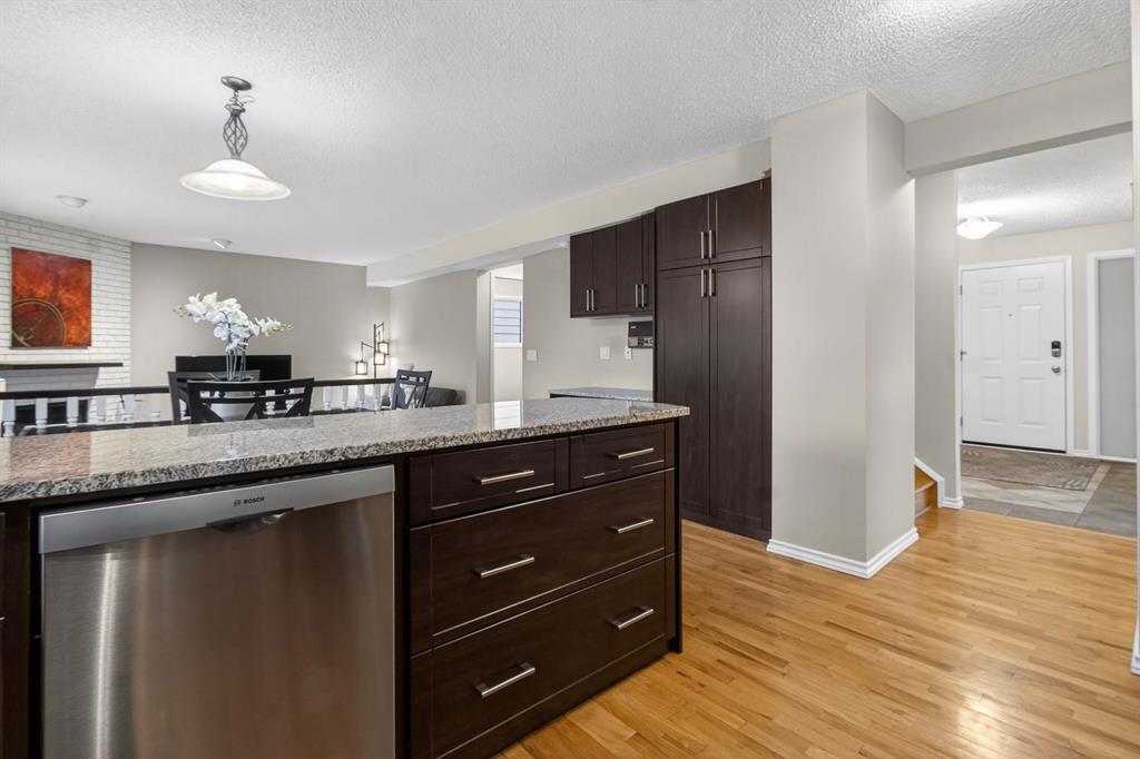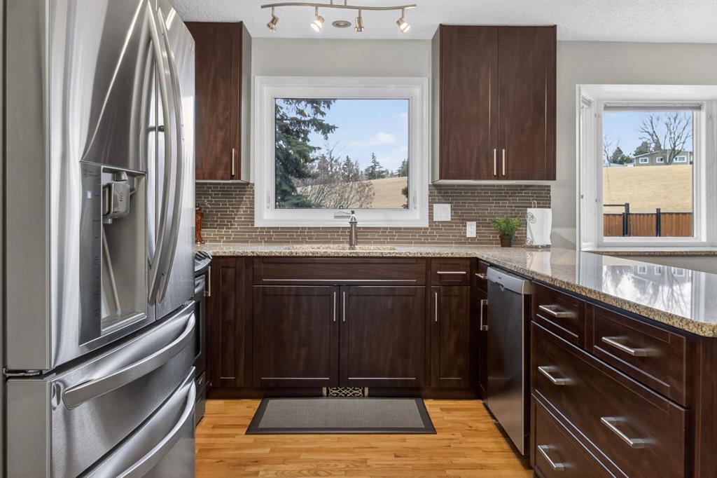 Welcome to this beautifully updated family home tucked into the heart of Beddington Heights, where comfort, warmth, and everyday convenience come together perfectly. From the moment you step inside, a spacious front foyer sets the tone and leads you into a bright, welcoming living room and elegant formal dining area, the perfect setting for holidays, celebrations, and unforgettable gatherings with family and friends. Rich hardwood floors flow throughout, while the attached double garage makes daily life effortless. At the heart of the home, the open-concept kitchen invites connection and conversation, featuring a large granite island and space for casual dining. Just a few steps down, the sunken family room creates a cozy retreat, complete with a wood-burning fireplace and newer patio door that open to the backyard, a seamless blend of indoor comfort and outdoor living. Step outside and fall in love with the huge south-facing yard backing directly onto peaceful green space. Framed by a new metal fence, this private outdoor oasis is perfect for summer entertaining, kids at play, and pets to roam freely in the sunshine. The main floor also offers a beautifully functional office with custom built-ins and a stylish 2-piece powder room with additional storage, thoughtfully designed for modern family living. Upstairs, three spacious bedrooms provide room for everyone to unwind. The primary retreat is truly special, featuring its own private balcony, a warm gas fireplace, and a 4-piece ensuite — your personal sanctuary for quiet mornings and peaceful evenings. The fully developed basement expands your living space even further with a large family room, a second gas fireplace, laundry, and abundant storage, ideal for movie nights, hobbies, and growing families. This home has been upgraded throughout, including an updated kitchen, newer hot water tank (2021), rubber driveway and garage pad, hail-resistant shingles (2022), new patio doors, new steel fence, new attic insulation, 11 solar panels, central air conditioning, new windows, and a powder-coated exterior designed for long-lasting durability. Perfectly located close to schools, shopping, transit, and Nose Hill off-leash dog park, this home offers the rare combination of thoughtful upgrades, incredible outdoor space, and an unbeatable location. Don’t miss your chance to fall in love with this one of a kind Beddington Heights home backing onto green space.