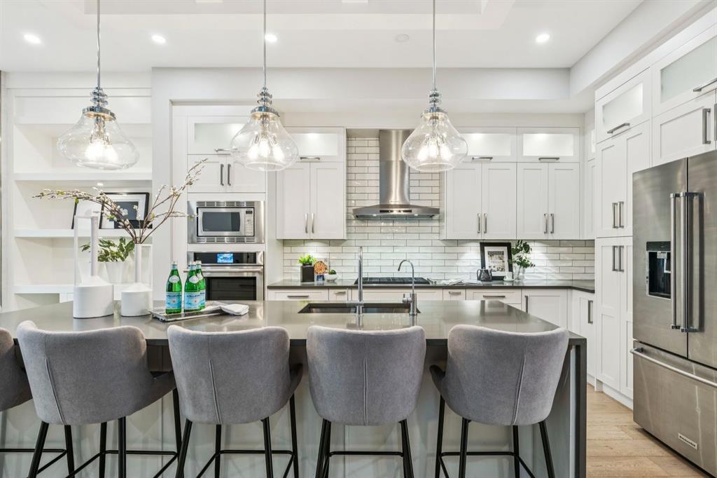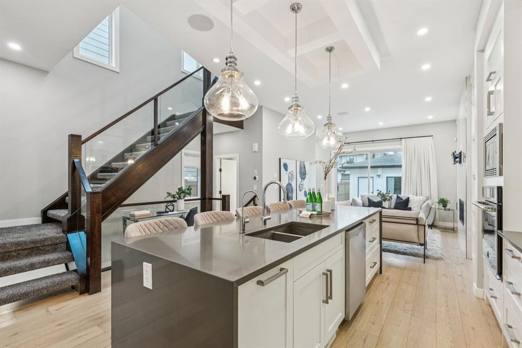 Proudly presenting this incredible family home ideally located in a welcoming, family friendly community just steps from Westmount Charter school, parks, and the Bow River pathway system. Offering over 2,700 sq ft of thoughtfully designed living space, this home blends modern luxury with everyday functionality. Stunning wide plank hardwood floors flow throughout the main and upper levels, while custom built-ins are seamlessly integrated throughout the home, adding both beauty and practical storage. The main floor is designed for connection with a beautifully panelled dining room, and centrally located chef’s kitchen ideal for gathering and entertaining. Highlights include white shaker cabinetry with glass accents, expansive waterfall quartz countertops, elegant pendant lighting, a high end Jenn-Air 6 burner gas cooktop and wall oven, and a premium kinetic water system. The inviting living area is showcases a sleek linear gas fireplace anchored by built-ins and a sliding glass door opens to a spacious composite deck, extending your area of entertainment. A tiled mudroom with built-in bench and abundant storage keeps daily life organized and stress free. Upstairs, natural light pours in through a large skylight, illuminating open riser stairs with glass railings and a bright second level that includes three generous bedrooms, a full bathroom with heated floors, and a convenient laundry room with sink. The primary retreat offers a peaceful escape with soaring ceilings, a large floor to ceiling picture window, custom walk-in closet, and a lavish ensuite featuring heated tile floors, a soaker tub, skylight, and tiled shower with bench and dual shower heads. The fully developed lower level is perfect for family movie nights and entertaining, featuring a large recreation room with built-in media wall, full bar with island seating and beverage fridge, a fourth bedroom, and a full bathroom. Additional lower level upgrades include rough-ins for Vacuflo, in-floor heating, and speakers. The backyard is thoughtfully designed for relaxation, with a large deck that flows into green space and leads to a double detached garage. Located close to Helicopter Park, Foothills Hospital, an off-leash dog park, and the Bow River Pathway system, this home offers an unbeatable lifestyle for families who value community, nature, and convenience. A prime opportunity to own a truly exceptional home in a welcoming neighbourhood, don’t miss it.