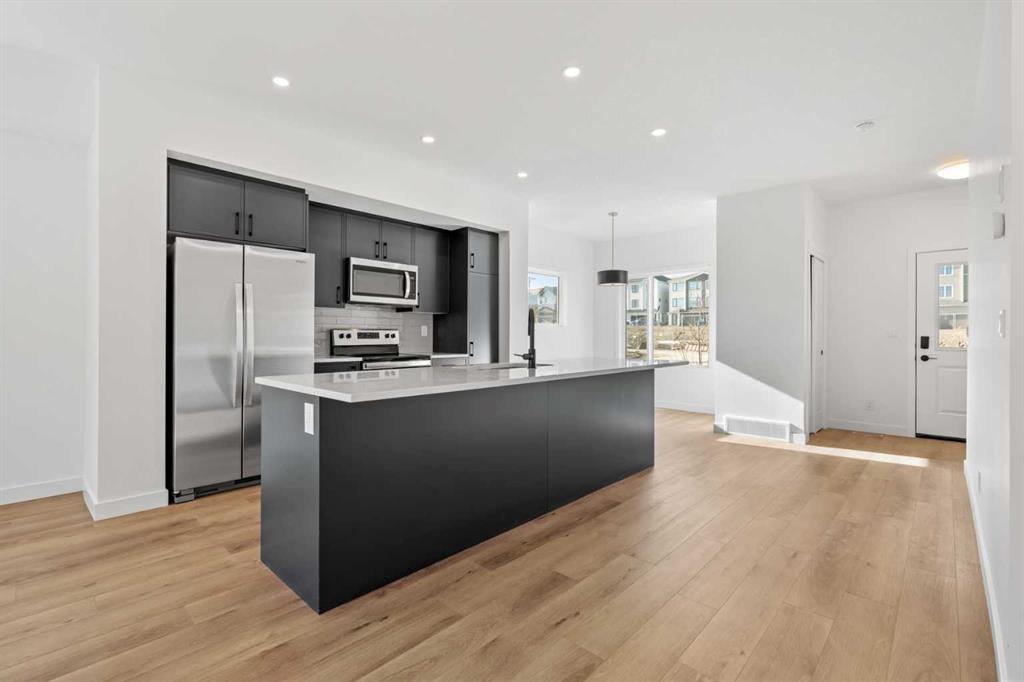 This brand-new townhome offers a spacious and functional layout ideal for families, professionals, or anyone looking for extra flexibility. The main floor features a modern kitchen positioned at the centre of the home, complete with a large island, stainless steel appliances, contemporary finishes, ample cabinetry, and storage. The dining area is located at the front of the home just off the foyer, creating an inviting space for everyday meals or entertaining. Toward the back of the home, the living room provides a comfortable retreat with direct access to a private balcony, perfect for enjoying fresh air. A convenient 2-piece bathroom completes this level.