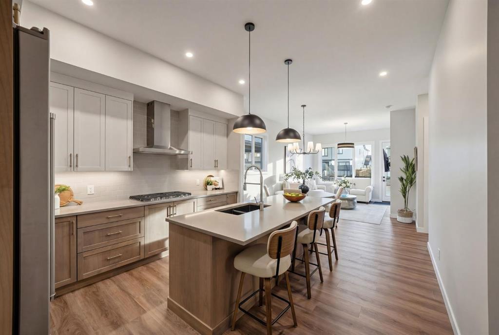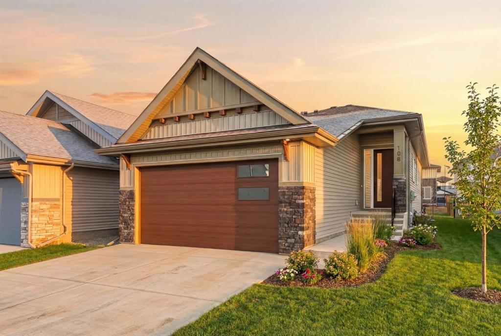 Incredible newly built bungalow by award-winning builder Renova Homes, offering refined craftsmanship, upscale finishes, and the ease of luxury single-level living in the highly sought-after community of Greystone! Backing a walking pathway and just minutes from all shopping amenities, the Spray Lakes Recreation Centre, and the Bow River, this prime central Cochrane location offers the perfect balance of convenience and lifestyle. Designed with discerning buyers in mind, the main floor features 10’ ceilings, oversized 8’ interior doors, sleek black matte finishes, upgraded lighting, and luxury vinyl plank flooring throughout the main floor. The chef-inspired kitchen is both elegant and functional, showcasing a premium KitchenAid built-in appliance package with 36\" gas range & 36 \" ceiling hood fan, quartz countertops, oversized island, 42” upper cabinetry, extended tile backsplash, and LED under-cabinet lighting—ideal for hosting or enjoying evenings at home. The open-concept dining and living areas are bright and inviting, centered by an electric fireplace and framed by large windows. Step outside to the full-width rear deck, with stairs to grade and a gas line for BBQ—perfect for effortless entertaining. The primary suite is a private retreat, complete with a spacious walk-in closet with built-ins and a spa-inspired ensuite featuring dual sinks, quartz countertops, soaker tub, and a beautifully tiled glass shower with upgraded 12” x 24” tile flooring and shower walls and a tiled shower niche-Thoughtful details include a timer exhaust fan and elegant wood-front medicine cabinet. A second main-floor bedroom or office provides flexibility for guests or working from home, while the well-appointed mudroom includes laundry with rough-in for a sink and space for future cabinetry, plus a convenient pass-through pantry with wood shelving. The fully developed basement expands your living space without compromise, offering a large recreation area with wet bar rough-in and dedicated electrical circuits, two additional bedrooms, and a full bathroom—ideal for visiting family or extended stays. Enhanced garage space with a 2’ extension and upgraded pre-finished door with windows and opener. Homes of this caliber and location don’t come along often! Notable upgrades include: central air conditioning, Roxul sound insulation between the living room and primary bedroom, powder room vanity with quartz countertops, upgraded light fixtures and high-end ceiling fans in all four bedrooms with added structural support, additional basement windows and enlarged office window, comfort-height toilets, HDMI conduit in the primary bedroom, living room & basement, eave plug with interior switch for seasonal lighting, and conduit for future fireplace media. Enjoy the benefits of new construction without the delay—move-in ready and fully protected under Alberta New Home Warranty. Experience elevated bungalow living in the heart of Cochrane—book your private showing today!