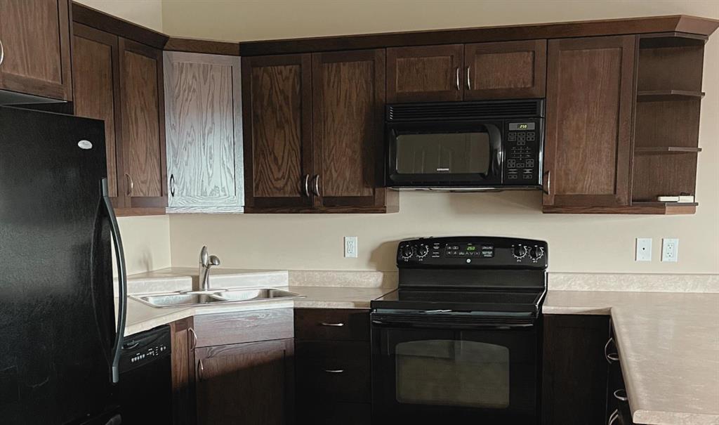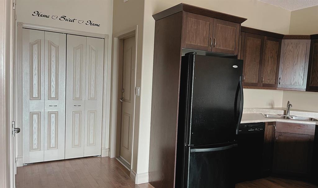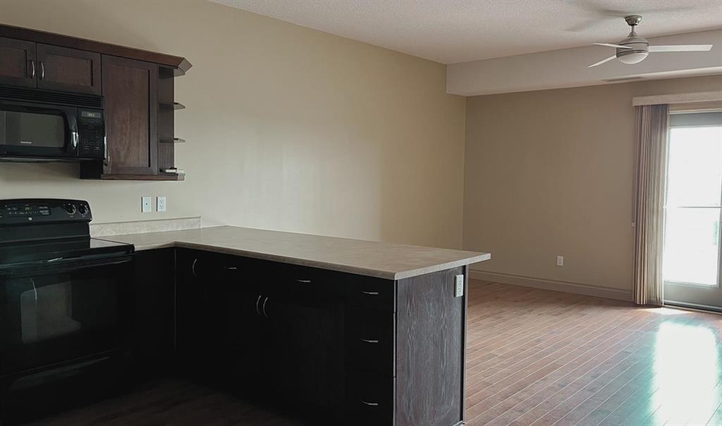 This top floor, top notch apartment with a view of the greenspace and playground proudly boasts 3 bedrooms, 2 bathrooms, heated attached storage, underground parking, additional pantry space and the greatest square footage in the building. The home has its own laundry room, so no need to save your coins to wash your knickers. There is beautiful laminate wood flooring throughout, except for in the bathrooms, which are outfitted with the softness and warmth of linoleum. The kitchen comes complete with all of the appliances, ample storage and additional seating opportunities at the peninsula. The open concept kitchen/living/dining area features glass patio doors to access the balcony where you will find the park view and hear the sounds of children playing as well as welcome plenty of sunshine into the living space. No need to worry about the sun increasing the temperature indoors during the summer months when there is air conditioning throughout the entire apartment. The main bathroom houses a large tub/shower combination and coordinating cabinets to the kitchen while the ensuite hosts a corner shower and double vanity, also matching the kitchen millwork. To enter the ensuite you will pass through the primary bedroom\'s spacious walk-in closet. The primary bedroom has a window on both the south and west walls offering all day natural light and each additional bedroom has a large west facing window. With the parking garage, elevator, security cameras and on-site (also wonderful) building managers - your worries will be few. If you have never considered life in a condo before, consider this: with the ever-changing costs of living, condo living offers a consistent condo fee that covers all of your building maintenance and repairs, water, sewer and gas utilities, garbage collection as well as internet and cable. For a steady monthly expense, you will experience all of the joys of owning your home and minimal worries and uncertainties.