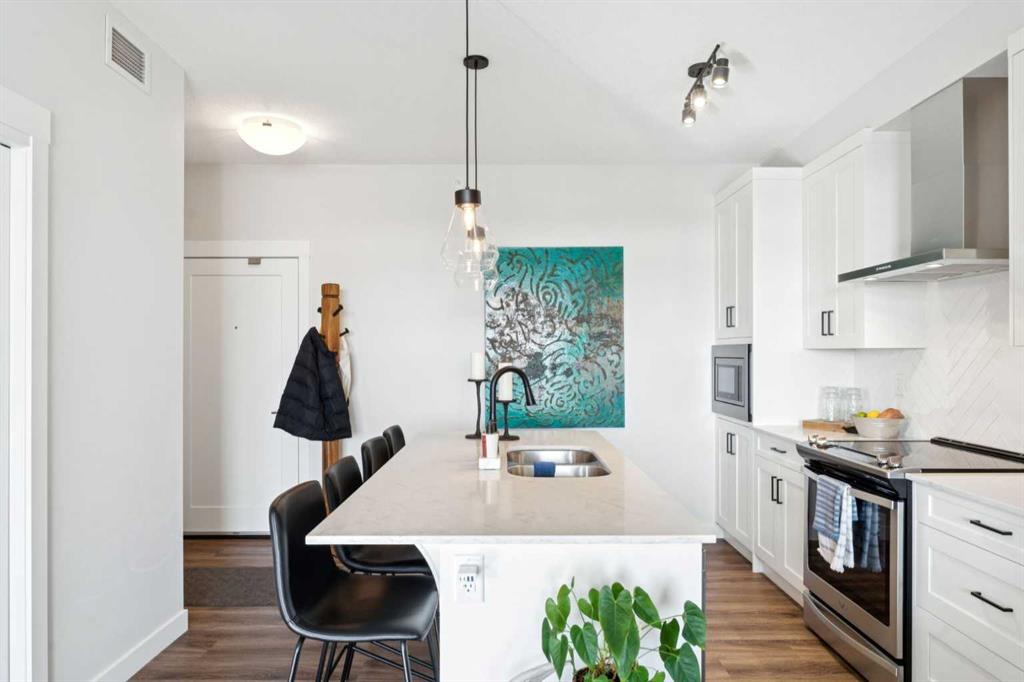 Look no further for your TOP floor unit with beautifully curated interiors and a functional layout. This unique \"Pratt\" layout by Logel Homes, is for the home buyer who wants a larger single bedroom and larger living quarters- no small bedrooms here! Enjoy upgraded finishings like the herringbone tiled backsplash, stainless steel appliance package, trendy black pendant lights, luxury vinyl plank flooring throughout and an integrated microwave that helps the functionality of the kitchen flow seamlessly. The spacious bedroom accommodates large furniture and welcomes personal items & belongings with a walkthrough closet. Tucked past the closet is a 4-piece ensuite with a tiled bath/shower and sparkling quartz counter tops. The unit has a second bathroom for guests- offering convenience and privacy for the homeowners. Just off the cozy living room are sliding balcony doors that take you to your private outdoor hub- which includes a gas barbecue! We cannot forget to mention, one of the best features of Auburn Bay... LAKE ACCESS! Enjoy year-round exclusive access to the Home Owners Association which includes a splash park, tennis courts, a fishing dock, a boathouse, picnic tables, gymnasiums and more. Nearby services like South Health Campus (3 min drive) and grocery stores, shopping, entertainment and parks just a couple blocks away, makes Auburn Bay a community of choice for many. Complete with a titled parking stall (end stall) and an over-sized storage locker compared to other units, this is an ideal choice for vibrant living in one of Calgary\'s most desired neighbourhoods. LIKE-NEW, gently lived in, this unit is truly turn-key and could be yours today! *Mortgage at 1.69% may be assumed, subject to buyer qualification and lender approval. Please contact listing agent for details.