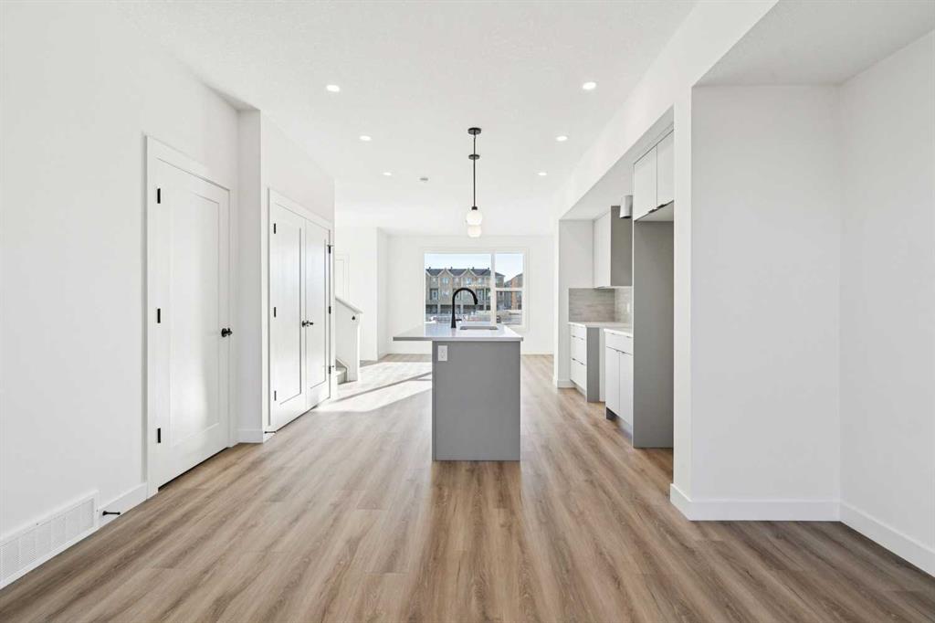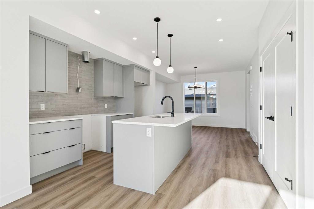The \"Irvine\" by Fifth Avenue Homes provides an open plan, with a well-appointed kitchen and comfortable living space. The main floor features a huge great room, adjoining dining area, dream kitchen highlighted by an island with breakfast bar, Quartz countertops & custom tile backsplash, access to the large 10x10 deck & 2 pc bath. The upper level offers two spacious bedrooms, 4 pc bath, a gorgeous primary suite with walk-in closet + a 3 pc ensuite & laundry. Undeveloped lower level with loads of storage and mechanical. Double detached garage. High-end plumbing & lighting fixtures throughout! Fifth Avenue Homes is well known for above standard finishings & attention to detail both in design & workmanship. This listing has just been completed & is ready for occupancy – pick your possession & move right in. Just minutes away from East Hills Shopping Center (Costco, movie theatre, shops & restaurants), close to future CBE elementary school site & 10 minutes to downtown on the Max Purple transit. Belvedere offers a wonderful family lifestyle with parks, natural wetlands and pathways. Book a showing with your Realtor today!