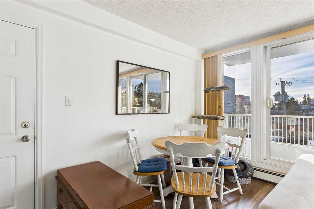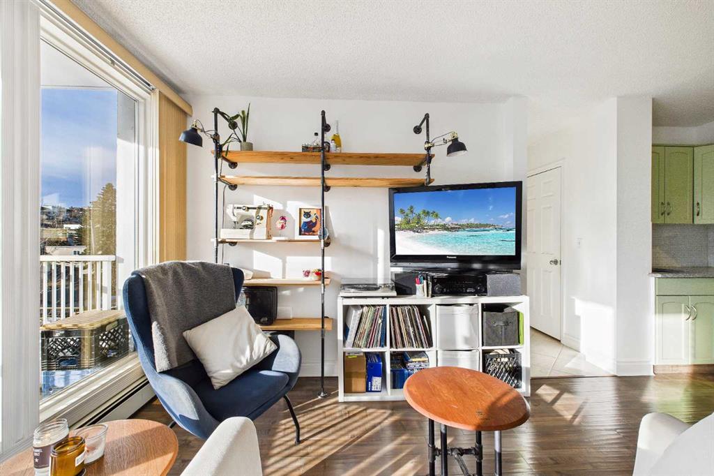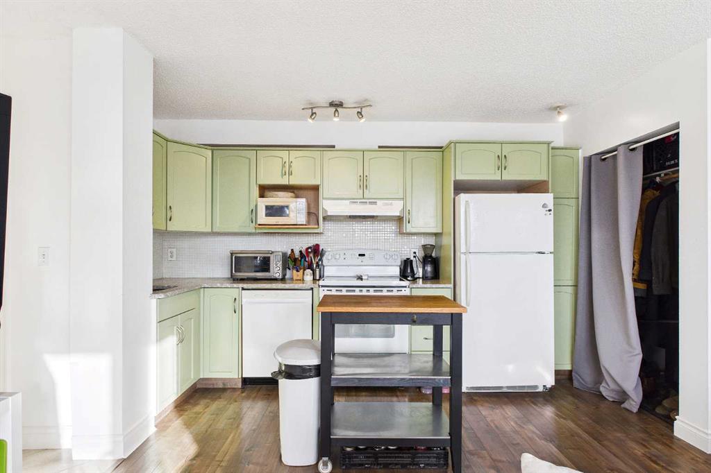 Welcome to the “AURORA PLACE“ this adorable one-bedroom condo perfectly situated just steps from the vibrant shops, cafés, and restaurants of 17th Avenue. This inviting home blends comfort and convenience and affordable condo fees making it ideal for first-time buyers, professionals, or anyone looking to enjoy an urban lifestyle without sacrificing coziness. Inside, the thoughtfully designed layout offers a bright and functional living space featuring hand-scraped laminate floors, a trendy yet spacious kitchen with mint green cabinets, lots of counter space, updated backsplash, a movable island and additional storage across the top of the cabinets if needed. The flexibility of the open concept layout flows seamlessly together offering a cozy living room and still room for a dining table if desired. The whole main living space is accented with a large south-facing balcony, where you can soak up sunshine all day long and perfect for a morning coffee or relaxing evenings. Large windows flood the space with natural light, creating a warm and welcoming atmosphere throughout. Adding to the convenience, this home comes with in-suite laundry for everyday ease, a spacious primary bedroom and 4 piece bathroom. Additional highlights include a separate storage and a dedicated parking stall eliminating the stress of inner-city parking, and a well-maintained building in a highly desirable location. With transit, parks, nightlife, and daily amenities just moments away, this charming condo offers the best of city living in a space that truly feels like home. Most pets are allowed with board approval, however dogs are not allowed.