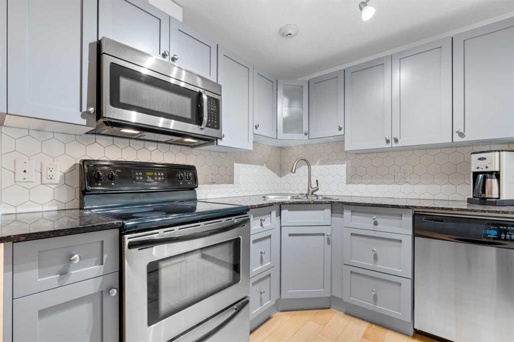 Fantastic Sunnyside Condo in an amazing location – backing on McHugh Bluffs and Sunnyside pathway system, with walking trails and parks, and downtown, at your doorstep. Experience main floor living with this immaculate, move-in ready 2 bedroom condo offering you everything you could need for those looking for the urban vibe while still being surrounded by trees and greenery. Enter through the secure building entrance, down a short hallway, and enter into the generous entry way of this condo. The warmth of the hardwood flooring blends beautifully with the modern décor. Boasting an open concept, bright living room that can accommodate a multitude of sofa configurations, two glass-door cabinets are included that can flank your TV, a cozy dining nook, lovely kitchen with stylish grey cabinetry, tile backsplash, granite countertops, and stainless steel appliances. You will enjoy the kitchen for its efficiency and the full size pantry for extra convenience and storage. The large 4 piece bathroom has tiled walls, a large soaker tub and equally large tiled shower, and a shelved storage area for towels, supplies, etc. The large primary bedroom has a very spacious walk-in closet with built-ins, shelves and drawers, and a second deep closet for added storage – of which there is no shortage of in this unit. The second bedroom is an ideal flex room:: keep it as a bedroom, use it as an office, convert it to a home gym, whatever your heart desires. The in-suite laundry includes a stacked washer and dryer so no leaving home to get caught up on laundry after your morning run. It has to be stated that this home is perfect for the first-time home buyer, someone wishing to downsize, the downtowner, or an investor – lots of options here. Discover everything this home has to offer, with walking distance to grocery stores, cafes, minutes to U of C, SAIT, Foothills and Children\'s hospital. Walk to Prince’s Island Park to enjoy the summer festivities, discover Sunnyside and Kensington community offerings, knowing that transit is minutes away. Check out the interactive iGuide for a virtual walkthrough of this property – you won’t be disappointed.