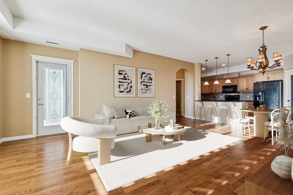 Welcome to Sierras of Evergreen — a premier 55+ adult living community — offering this bright, spacious, south-facing 2 Bedroom + Den, 2 Full Bath condo on the 4th floor. This well-maintained, move-in ready home features a functional open-concept layout filled with natural light, ideal for comfortable everyday living and effortless entertaining. The air-conditioned interior showcases an inviting electric fireplace, generous living and dining areas, and in-suite laundry. Step outside to the large private balcony with gas BBQ hookup — perfect for relaxing or seasonal grilling.