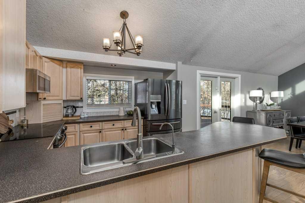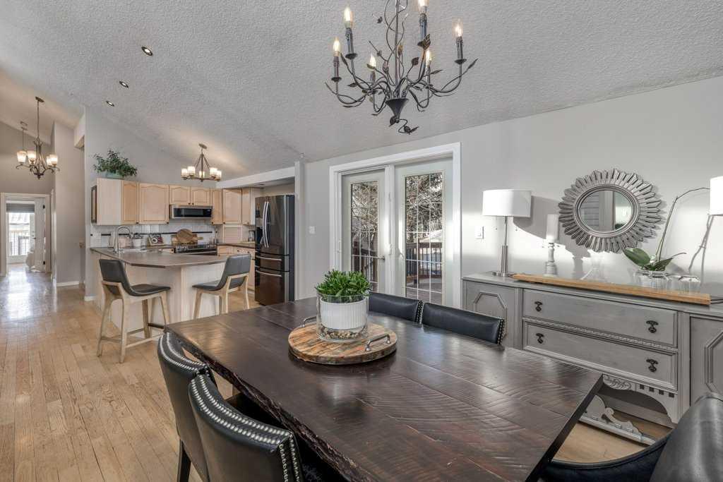 Experience the best of acreage living just minutes from Calgary city limits on this picturesque 4.28-acre property featuring a beautifully updated home full of character. The unique split-level design offers three bedrooms on the main level, including a spacious primary suite complete with a luxurious ensuite showcasing heated floors, a soaker tub, double sinks, and abundant built-in storage. Vaulted ceilings and hardwood flooring enhance the main living areas, while the sunken family room creates a warm and inviting space with a gas fireplace and direct access to the outdoors.