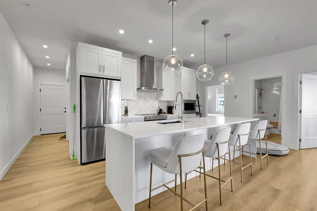 Discover this stylish 916 sq ft, 2 bedroom condo in the heart of one of Calgary’s most walkable communities. This end unit has been extensively upgraded for comfort and design, and offers a premium urban lifestyle. You will be impressed with the beautifully Upgraded Kitchen which includes quartz countertops, full height cabinetry, custom tile backsplash, and a built in hood fan. The bright, open layout features luxury vinyl plank flooring, large windows and lots of space for comfortable living. The condo is also equipped with central A/C for the hot summer days! The primary bedroom includes a walk-in-closet and a four piece ensuite with a double vanity. There is a second bedroom, a three piece bathroom, in suite laundry and a large balcony to complete this home. Extras include titled underground parking along with an assigned storage unit. Steps from South Health Campus, the YMCA, public library, and local dining/shopping and quick access to Deerfoot and Stoney Trail, you are never far from where you need to go. Book your showing today!