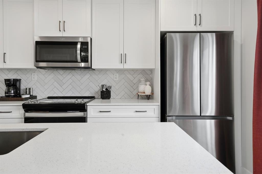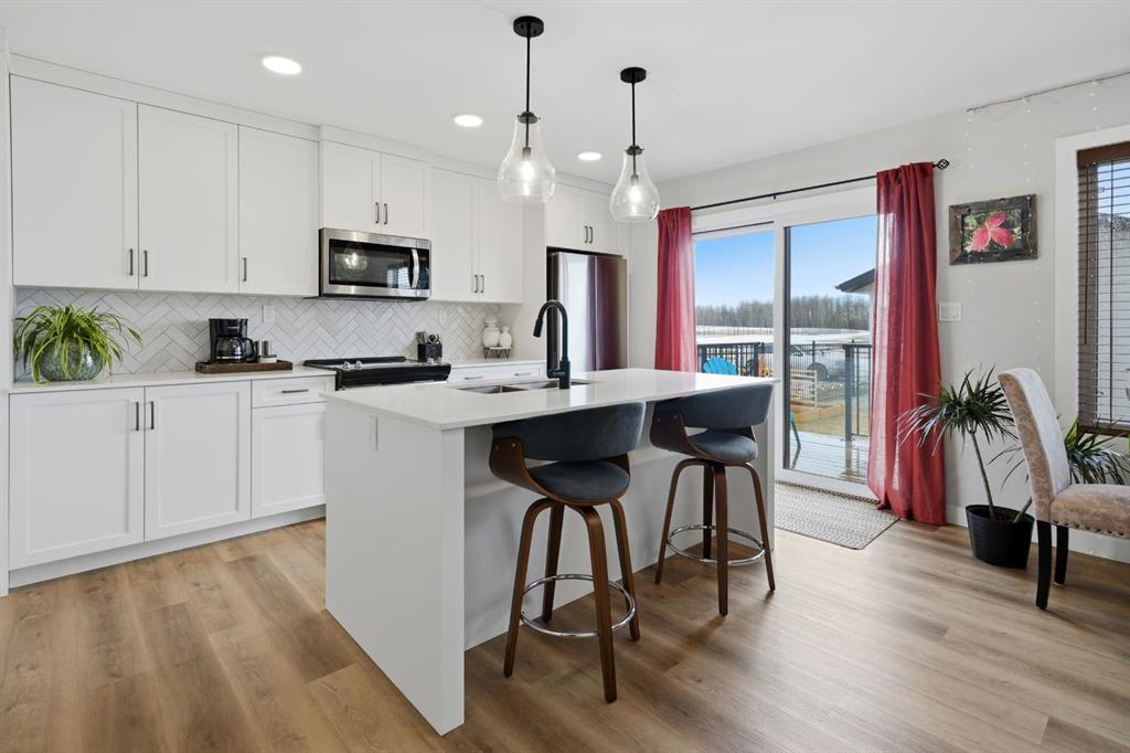 This 1,344 sq ft bright and modern end-unit townhome is located in the highly desirable community of Sixty West. Thoughtfully designed for those who appreciate both style and a connection to nature, the neighbourhood is surrounded by five acres of forest, a scenic pond, parks, and over 4 km of walking trails—offering breathtaking sunsets and a true sense of space and tranquility. The main floor features a stylish kitchen and dining area highlighted by quartz countertops, a statement herringbone tile backsplash, and a generous island. Step outside through the patio door to enjoy your peaceful views from the deck and yard, with convenient access to the double detached garage. Upstairs, you’ll find three spacious bedrooms and a four piece bathroom, including a comfortable primary bedroom complemented by a 3-piece ensuite and walk in closet. Enjoy being within walking distance to the Gulls Stadium, making it easy to catch a game and be part of the vibrant community atmosphere. For added peace of mind, the balance of the original 10-year National New Home Warranty, is transferable to the new owner, providing long-term protection and confidence in your investment. Close to shopping, restaurants, parks and schools. This home is a rare opportunity for both homeowners and investors and has NO CONDO FEES!