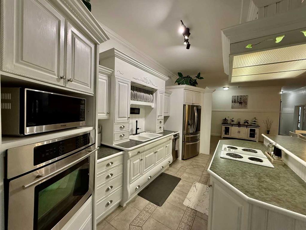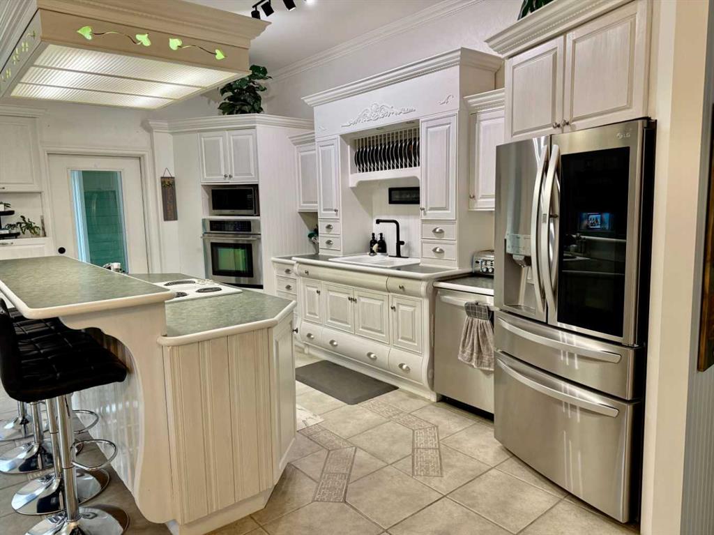 Step inside through the east entrance and you’re welcomed by an impressive sense of space. The expansive dining area flows seamlessly into the thoughtfully designed kitchen, featuring tile flooring, an eating bar, updated fridge and wall oven, walk-in pantry, and soaring 10 ft. ceilings. Just off the kitchen, the 3-season sunroom—roughed in for electric heat—offers the perfect place to unwind while enjoying the views.