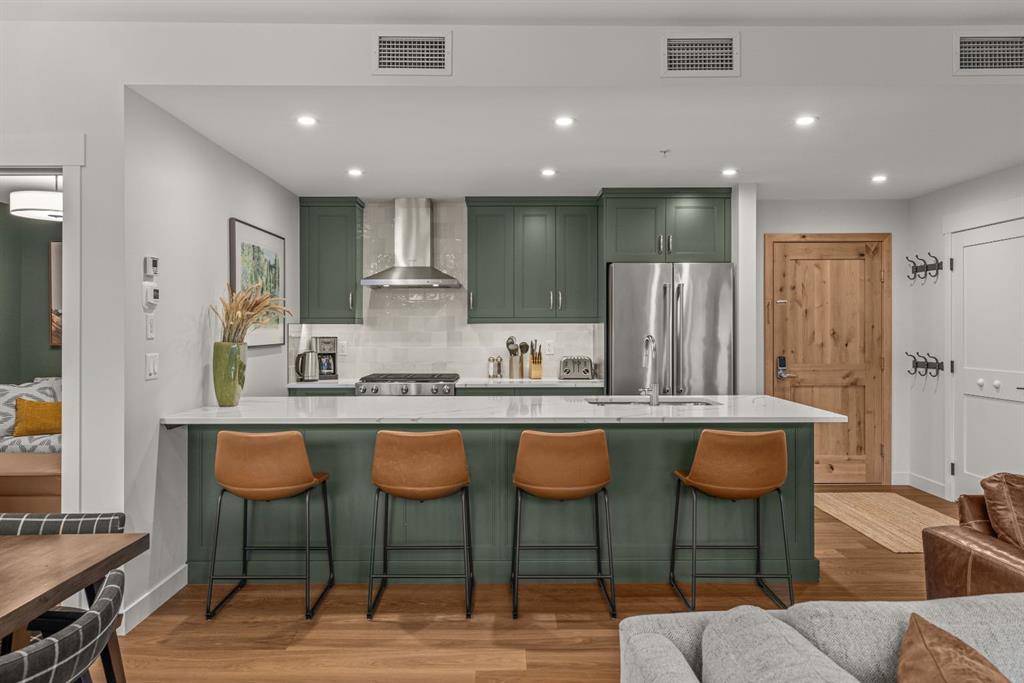 Tourist zoned and revenue-ready in Spring Creek! Across the street from Bridgette Bar and an easy scenic stroll to shops, restaurants and Main Street, Canmore. This is a rare opportunity in Timberstone Lodge, offering 4 bedrooms, 3 full bathrooms, and a southwest corner position on the third floor with scenic mountain views. Designed for guest comfort and strong short-term rental appeal, the open-concept layout features generous sized gathering spaces, a highly functional kitchen with KitchenAid stainless steel appliances, quartz countertops, and solid wood cabinetry. Step outside to an oversized covered deck (over 30 feet long!) with room to BBQ, dine, and lounge. Two spacious, primary-style bedrooms each offer beautiful ensuites. One with dual sinks, a soaker tub, and a modern curbless shower. The second includes a walk-in closet, another five-piece ensuite, and a private water closet. Two additional bedrooms and the 3rd full bath, provide a rare short term rental option for groups to enjoy the convenience of staying together in one property. Underground heated parking and storage complete this amazing opportunity. Spring Creek’s superior craftsmanship includes BUILT GREEN certification, with geothermal heating and cooling. Enjoy Timberstone’s amenities including an outdoor hot tub with mountain views and a fitness room, plus an unbeatable Spring Creek lifestyle. A standout short-term rental package in one of Canmore’s most in-demand vacation rental spots!