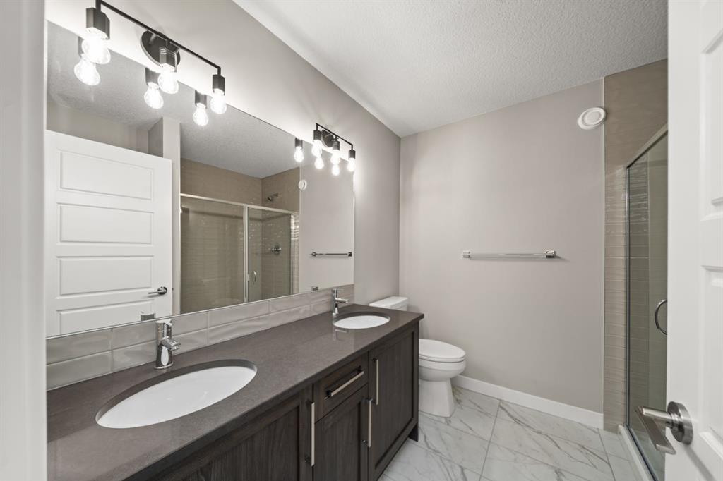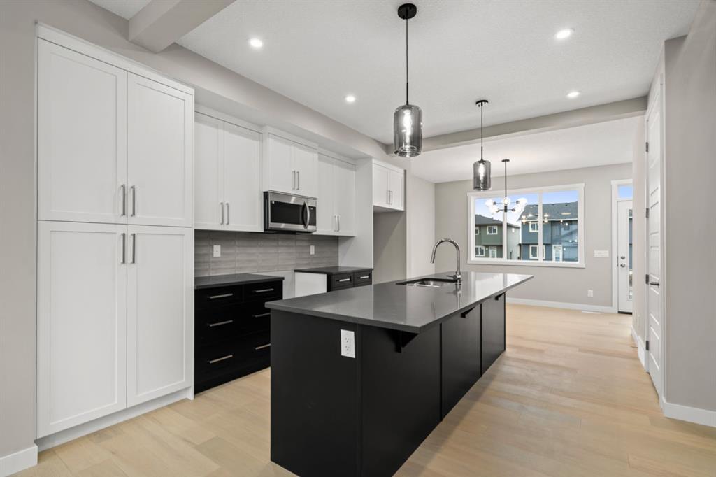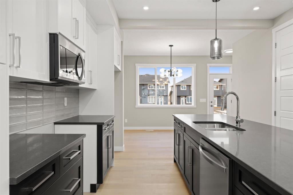 Welcome to 110 Sora Gardens! This kitchen is a standout: modern quartz countertops, stainless appliances, plus a generous island that works for meal prep, homework, or hosting friends-all while staying connected to the rest of the main floor through the open plan. Engineered hardwood on the main level adds durability and an upscale feel that stands the test of time. On the upper level, the primary suite provides a private retreat with ensuite and walk-in closet. Two additional bedrooms offer flexibility-space for kids, guests, or a home office. Upper-floor laundry makes daily routines easier. A separate side entrance to the basement provides future flexibility for expanded living space or potential for suite (subject to city approval). With no condo fees, the peace of mind that comes with a new-home warranty, and thoughtful features throughout, this home is built to give strong long-term value and low maintenance.