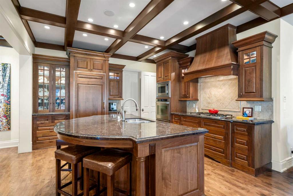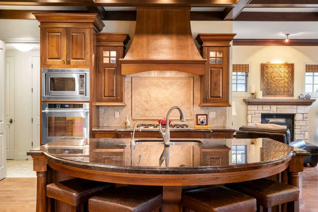 This stunning Laratta built executive family residence, is an architectural masterpiece nestled on a most coveted Upper Mount Royal tree lined street overlooking Talon Park. Set on a private, estate sized 70\' x 194\' west facing lot surrounded by mature trees, meticulous landscaping, English country gardens, offering a rare blend of historic grandeur, modern luxury & resort-style living. Boasting 7158 sq. ft. of impeccably designed living space, this residence showcases gleaming hickory & hardwood floors throughout the upper levels, with beamed ceilings, crown mouldings, solid core doors, extensive millwork, designer fixtures & an abundance of natural light through expansive windows. The enclosed foyer opens to the entertaining sized great room with built-ins & gas fireplace offers seamless indoor outdoor flow. The gourmet kitchen with granite countertops, a striking oversized island with circular eating bar, loads of custom cabinetry, spacious pantry, beamed ceilings, professional appliances, effortless flow into the family sized dining area & sitting area with fireplace overlooking the yard. A private office with custom bookcases overlooks Talon park, while the main floor primary suite, currently a second family room, features tranquil views, a luxurious spa-inspired 5-piece ensuite with soaker tub, steam shower, dual sinks, marble countertops, heated marble floors & abundant storage. A guest powder room, private laundry with cabinetry & a functional mudroom leads to the heated extra wide double attached garage. The upper level offers five spacious bedrooms, including a primary bedroom with double closets, luxurious ensuite and overlooks the tranquility of the west yard. The secondary bedrooms all with ensuites & a retreat area deliver exceptional comfort, flexibility & privacy. The lower level designed for elevated leisure & entertainment, features an expansive family room with built-in cabinets, billiards room, a large wrap-around wet bar with dishwasher, microwave & beverage fridge, temperature controlled wine cellar with tasting lounge, a bedroom with ensuite, a large playroom currently a ballet studio & glass enclosed exercise area plus exceptional storage. Outdoors, the tranquil west facing yard is home to manicured grounds framed by mature trees, offering sun drenched lounging areas, distinct living spaces, patio zone perfect for gatherings, a full irrigation system & ample room for a future pool. This estate harmonizes style, functionality, serenity & ideally located within walking distance to top rated schools, parks, River Park, the Elbow River Pathways, community tennis courts, outdoor pools, Glencoe Club, Calgary Golf & Country Club, public library, downtown, the vibrant shops, restaurants & culture of 17th Avenue, 4th & 14th Streets. This rare offering represents an unparalleled opportunity for the discerning buyer seeking architectural excellence, intentional design, premium materials - this is more than a home, it\'s a statement of refined living.