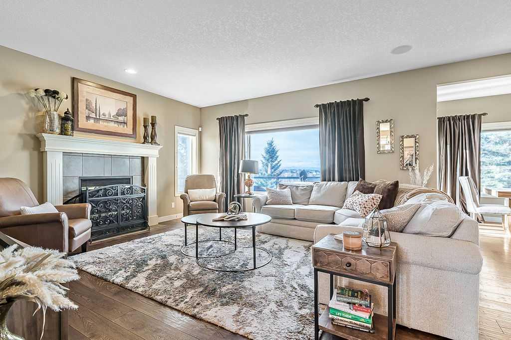 PREMIUM RIDGE LOCATION WITH SWEEPING MOUNTAIN VIEWS and backing onto serene green space, this fully developed two storey walkout home offers nearly 3,500 sq. ft. of exceptional living space in a great Tuscany location. Designed to capture natural light and breathtaking scenery, the home features lots of large windows and a well thought out floor plan. There is a spacious island kitchen with granite countertops, gas stove, and a walk through pantry with custom shelving and a secondary fridge. A sun filled living room with gas fireplace and stunning views, while a dedicated main floor den provides an ideal retreat for work or relaxation. There is a spacious front foyer with an ultra convenient large walk through closet to the mudroom. The mudroom and laundry area are beautifully finished with custom ceiling height built-in cabinetry. Upstairs, the king sized primary suite with a fireplace, spa inspired ensuite, and features a tranquil ZEN SITTING AREA OVERLOOKING THE RIDGE AND MOUNTAINS. Bedrooms two and three have custom closet built-ins. The fully developed walkout basement expands the living space with a large family room and fireplace, wet bar, full bathroom and garden door access to a covered patio. This is a perfect opportunity to own a gorgeous view property combining comfort and convenience, just minutes from schools, amenities, and all that Tuscany has to offer including quick easy access to downtown and the Rocky Mountains.