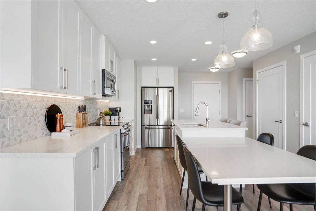 Welcome to Vivace North, where modern design meets effortless everyday living in the heart of West Springs. This beautifully upgraded 2-bedroom, 2-bathroom condo blends style and functionality, creating a home that feels as sophisticated as it is comfortable. The chef-inspired kitchen features sleek stainless steel appliances, full-height white cabinetry, and modern white quartz countertops. The step-down island is both practical and unique, offering bar seating on one side and a built-in dining table on the other, perfect for entertaining or relaxed daily meals. The open-concept living space is warm and inviting, with luxury vinyl plank flooring and large east-facing windows that fill the home with natural light. Step outside onto two private balconies, ideal for morning coffee or evening unwinding. Both bedrooms offer walk-through closets with direct access to bathrooms, while the second room makes a perfect guest bedroom or home office. This unit has NO CARPET and pride of home ownership is evident! Enjoy added convenience with in-suite laundry, a storage locker, bike storage, and tandem double parking stalls. Outside your door, you’re steps away from Mercato West, Vin Room, Blanco, Fergus & Bix, Una Pizza, and more, plus grocery stores, boutique shops, and top-rated schools. Downtown is only 15 minutes away, and the mountains are within easy reach for your next weekend escape. Perfect for investors, first-time buyers, or downsizers, this home at Vivace North combines modern comfort, unbeatable convenience, and the vibrant energy of Calgary’s west end.