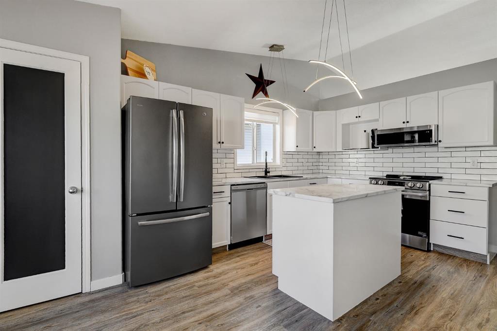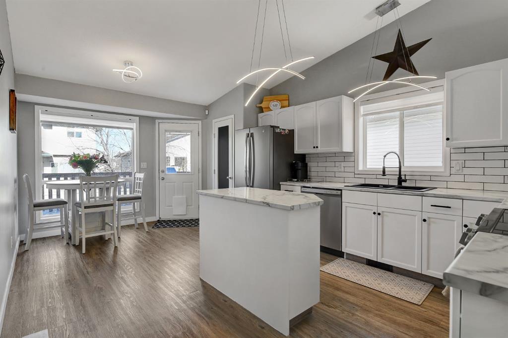 Completely refreshed and truly move-in ready, this beautifully updated bungalow sits on a quiet street in the desirable, family-friendly community of Pinnacle Ridge. The home has undergone a full facelift featuring new paint throughout, new carpet, new countertops, refinished cabinets, tile backsplash, updated lighting fixtures, and central A/C, making it turnkey for its next owner. The spacious entry leads up to a bright, cozy living room and into the kitchen with island, pantry, newer appliances, and a sunny dining area with a large window. Down the hall you’ll find the primary bedroom with full ensuite, two additional bedrooms, and a main bathroom, giving the main floor a light and airy feel. The fully developed basement offers an open layout with a dry bar, flex space/ family room, plus an additional large bedroom and full bathroom. The laundry room is tucked away with ample storage to keep everything organized and out of sight. Outside, enjoy the oversized 22x24 attached finished garage with radiant tube heating, an extra-wide driveway ideal for RVs or extra vehicles, a fully fenced backyard with a dog run, and a rear deck perfect for relaxing or entertaining. This home is truly turnkey and ready for its new owner.