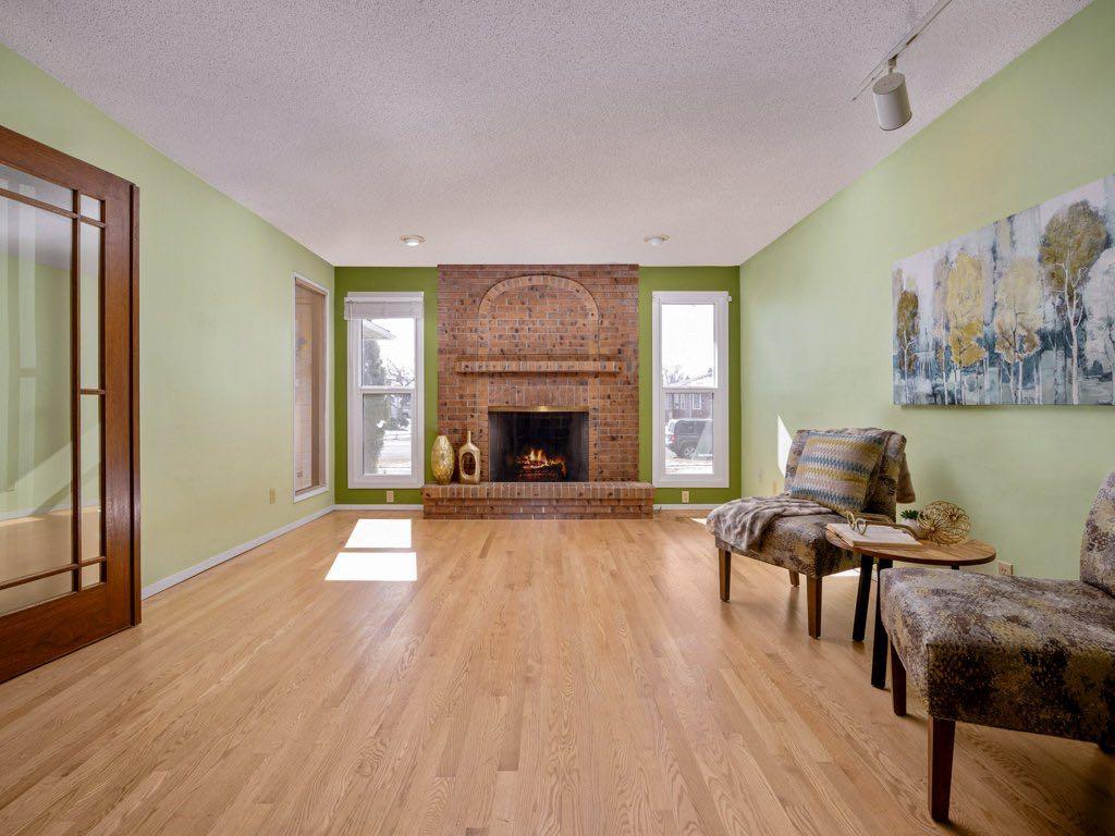 The bright living room features beautiful hardwood floors, a charming wood-burning fireplace, and built-in bookshelves along one wall—creating a warm and inviting place to relax or entertain. Glass doors add character and allow natural light to flow through the space.