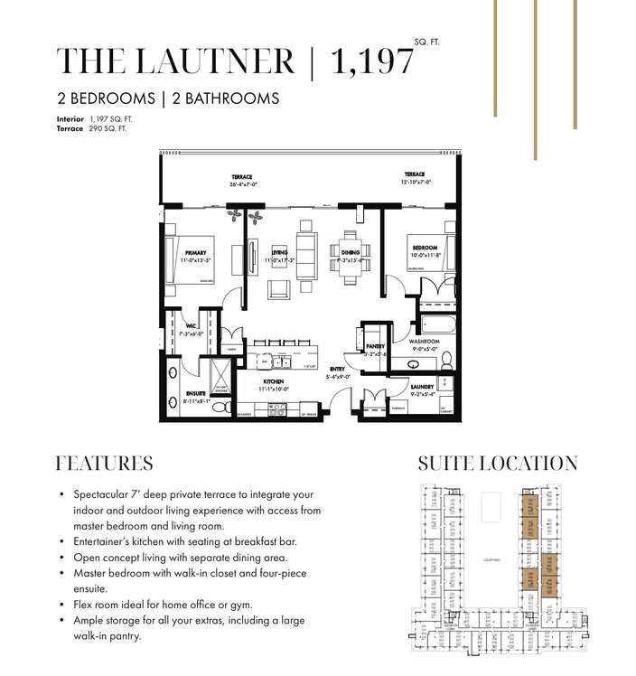 This exceptional property combines functional design with refined finishes, delivering a home that truly elevates everyday living. The expansive 7\'-deep, full width private terrace seamlessly blending indoor and outdoor living, with elegant access from both primary bedroom, second bedroom and living room. Gourmet entertainer\'s kitchen with a stylish breakfast bar, perfect for casual dining and social gatherings. Sophisticated open-concept living and dining area designed for effortless flow and natural light. Luxurious primary suite featuring a spacious walk-in closet and a spa inspired four-piece ensuite. Photos contain digitally rendered and/or sample images.