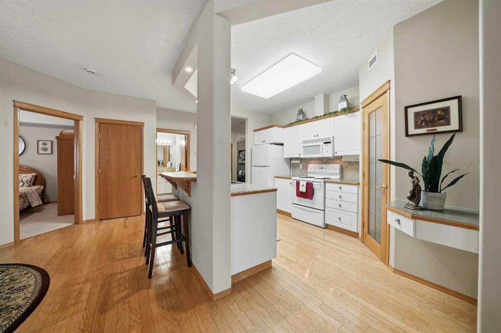 This spacious and beautifully maintained condo offers a grand first impression with a large foyer that sets the tone for the open and airy layout throughout. Walk into the large kitchen and enjoy the beautiful cabinets with plenty of counter space that is open to the dining room and living room, making this a great space to entertain your friends or spend time with family. The bright, oversized windows fill the space with natural light, making it a bright and sunny home. The two generous decks extend your living space outdoors—one accessible from the living room and the other one from the primary bedroom, perfect for morning coffee or evening relaxation. The unit features excellent in-suite storage, plus an additional storage locker. You\'ll also enjoy the convenience of two titled parking spots—one underground and one above ground. Located close to walking trails and shopping, this building offers an unbeatable lifestyle with a host of amenities: indoor pool and hot tub, library, games room, community center, workshop, party room with a full kitchen, guest suites on each floor, craft room, fitness room and two roof top patios. New fridge in Aug 2025.