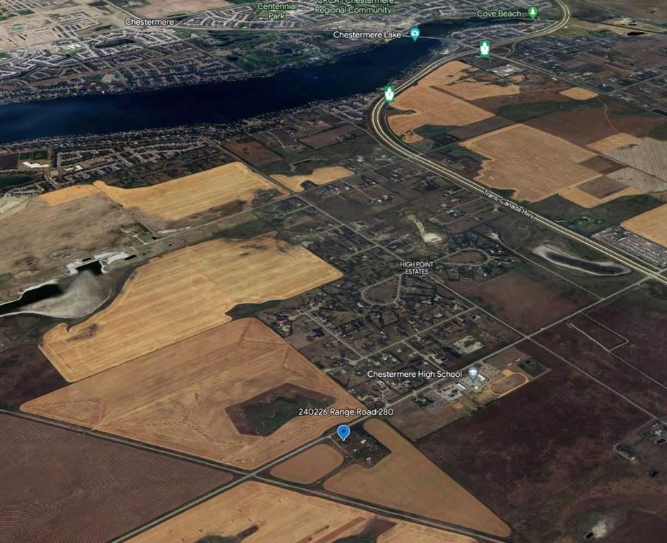 CENTRAL TO EXISTING INFRASTRUCTURE, HIGHWAYS, and future growth. Located adjacent to CHESTERMERE HIGH SCHOOL - Less than 1km east of Chestermere - 1.7km south of Trans-Canada Highway - 6.5km east of Calgary - and 12.5km west of the future De Havilland Field. Access to this land is DIRECT FROM HIGHWAY 791. There is bush along the north boundary and a rail line along the southeast. There are 19.99 ACRES of mostly farmed land. The clearing for the old homestead and farmyard is ideal for immediate use. There is a WIDE RANGE OF LAND USE OPTIONS (subject to approvals). This is a unique opertunity while Chestermere is growing and development in this area is increasing.
