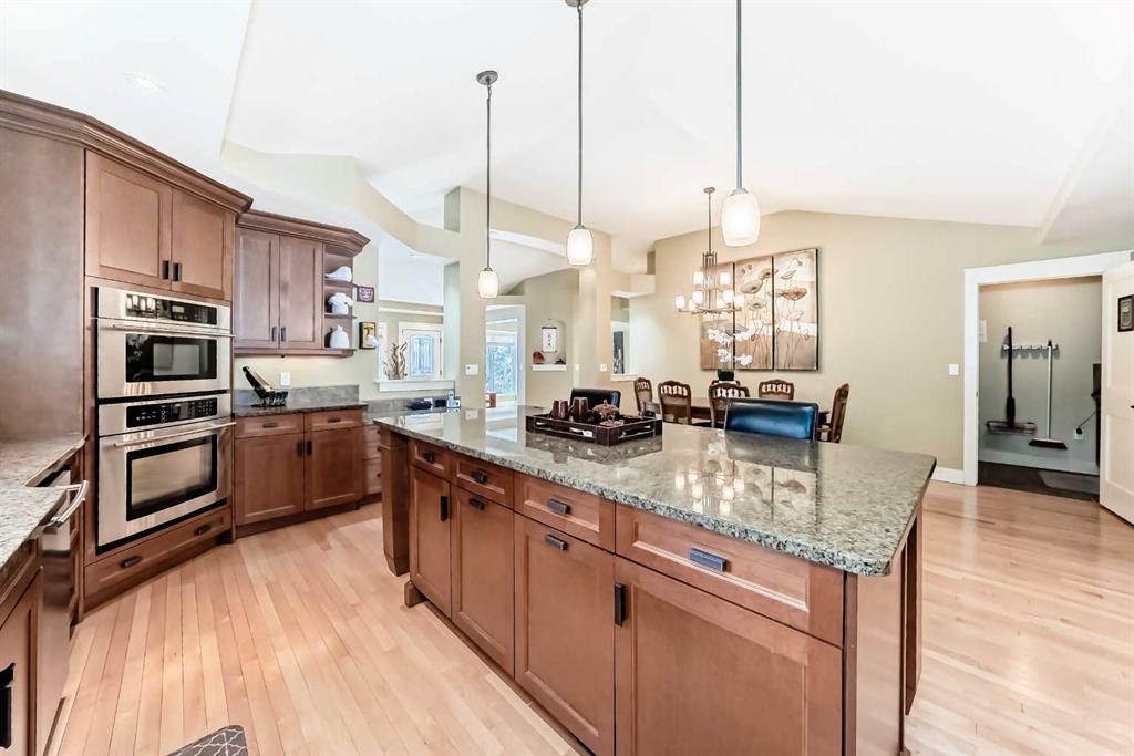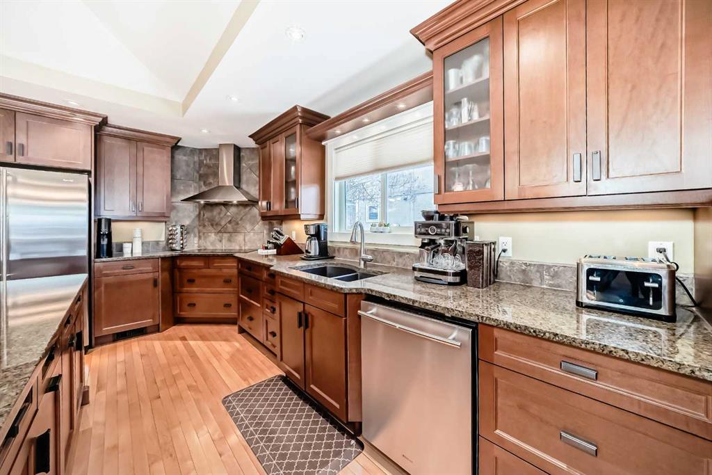 Welcome to a \'top\" location in West Dalhousie. This massive bungalow (over 2,000 sq ft on the main) was completely remodelled in 2011 and a number of upgrades since like triple pane windows on the main floor in 2022, a new roof in 2014, new AC unit 2023 and updated landscaping in the backyard in 2013. The main floor has hardwood throughout, a front living room w/ a wood burning fireplace which is very cozy during our long winters. The kitchen has a large island, high end appliances, which includes wall oven + microwave, along with granite counter tops, and dark brown cabinets. There is also a large dining room across, a laundry room w/ sink + a family room with gas fireplace at the back. The primary bedroom is large in nature with access to the yard, a double sided gas fireplace, a 5 piece ensuite, and a spacious walk in closet. There are 2 additional bedrooms + a 4 piece bathroom on the main floor. The yard is huge with a walking path along the back, a retaining wall, deck and pergola, shed and dog run along the east side. The lower level is spacious with over 1,200 sq feet of developed space. It has a fitness room, a large storage room, plus a huge rec/games room which acts as a media centre and an office right now. There is 4th bedroom that\'s perfect for guests or a teenager along with a 3 piece bathroom (walk in shower). There also is a tankless/on-demand water tank + an updated high efficiency furnace. Home is walking distance to the Dalhousie elementary school, HD Cartwright and a short drive to Sir Winston Churchill. Situated across from a large green space and within walking distance to Dalhousie C train Station make for a great location. Rarely do bungalows of this size come onto the market in NW Calgary.
