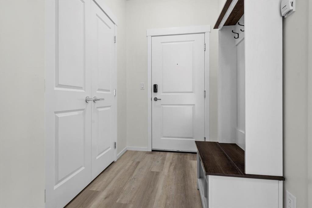 Are you looking for a bright, top floor home in a newer development with air conditioning? What about with a sunny SW covered balcony, steps to kms of pathways surrounding West Nose Creek? As a corner unit, sunlight flows through the home which is set back from the hall unlike most of the layouts in this development, and you can spend summer kicking back and BBQing in the sunshine. An original owner, this home was upgraded in several areas during initial construction. Enjoy no carpet with LVP throughout, which works well for a pet friendly place! The gorgeous kitchen is centered around the deluxe island and features stainless steel appliances, chess beveled backsplash, shaker style cabinets and 42-inch uppers, plus the 9 ft ceilings and over sink window assist to make this kitchen feel even larger. With upgraded quartz throughout the kitchen and bathrooms, also find additional drawers and built ins throughout. The large primary suite can accommodate a king sized bed with a customized walk-in closet that leads through to the ensuite. Here, the glass paneled shower also highlights the upgraded plumbing throughout. The second bedroom is across from the 4 piece bathroom, making this layout great for guests or even a roommate if so desired. The in suite laundry has been installed to maximize space in the storage room, and additional shelving with another electrical plug were added to ensure this was a great combination space your cleaning supplies and whichever cordless vacuum you chose to install. The titled parking spot is in the underground parkade and is close proximity to the assigned storage locker. This home is quick access to both Stoney Trail and 144th via Symons Valley, and the number of shops and amenities now in the Sage Valley area make this offering even sweeter. Will you spend your Saturday cruising out to the Rocky Mountains, or to shop in the Shoppes at Sage Hill? Contact your trusted advisor for a private showing and get in before She Gon’!